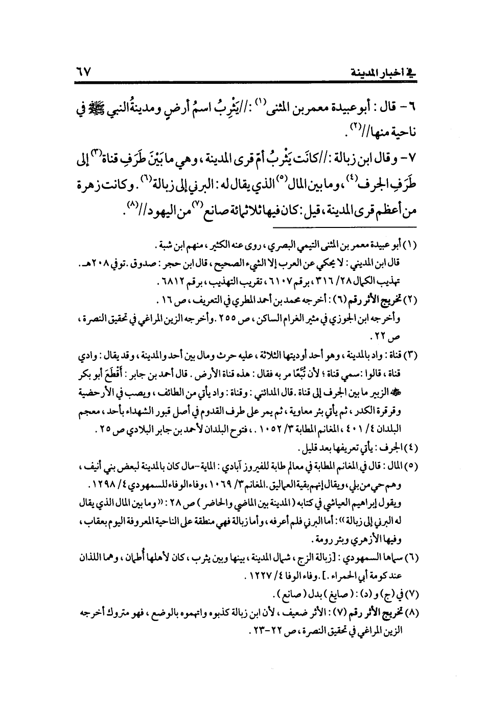 (¬٨) تخريج الأثر رقم (٧): الأثر ضعيف، لأن ابن زبالة كذبوه واتهموه بالوضع، فهو متروك أخرجه الزين المراغي في تحقيق النصرة، ص ٢٢ - ٢٣.