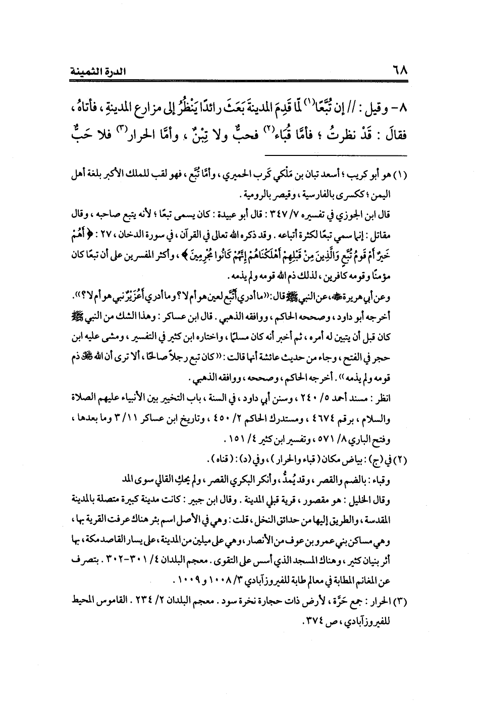 ٨ - وقيل: // إن تُبَّعًا (¬١) لمّا قَدِمَ المدينةَ بَعَثَ رائدًا يَنْظُرُ إلى مزارع المدينةِ، فأتاهُ، فقالَ: قَدْ نظرتُ؛ فأمَّا قُبَاء (¬٢) فحبٌّ ولا تِبْنٌ، وأمَّا الحرار (¬٣) فلا حَبٌّ