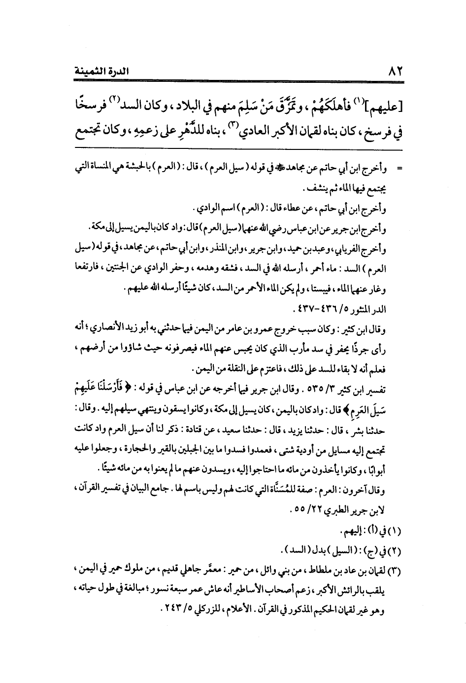 تفسير ابن كثير ٣/ ٥٣٥. وقال ابن جرير فيما أخرجه عن ابن عباس في قوله: {فَأَرْسَلْنَا عَلَيهِمْ سَيلَ العَرِمِ} قال: واد كان باليمن، كان يسيل إلى مكة، وكانوا يسقون وينتهي سيلهم إليه. وقال: حدثنا بشر، قال: حدثنا يزيد، قال: حدثنا سعيد، عن قتادة: ذكر لنا أن سيل العرم واد كانت تجتمع إليه مسايل من أودية شتى، فعمدوا فسدوا ما بين الجبلين بالقير والحجارة، وجعلوا عليه أبوابًا، وكانوا يأخذون من مائه ما احتاجوا إليه، ويسدون عنهم ما لم يعنوا به من مائه شيئًا.