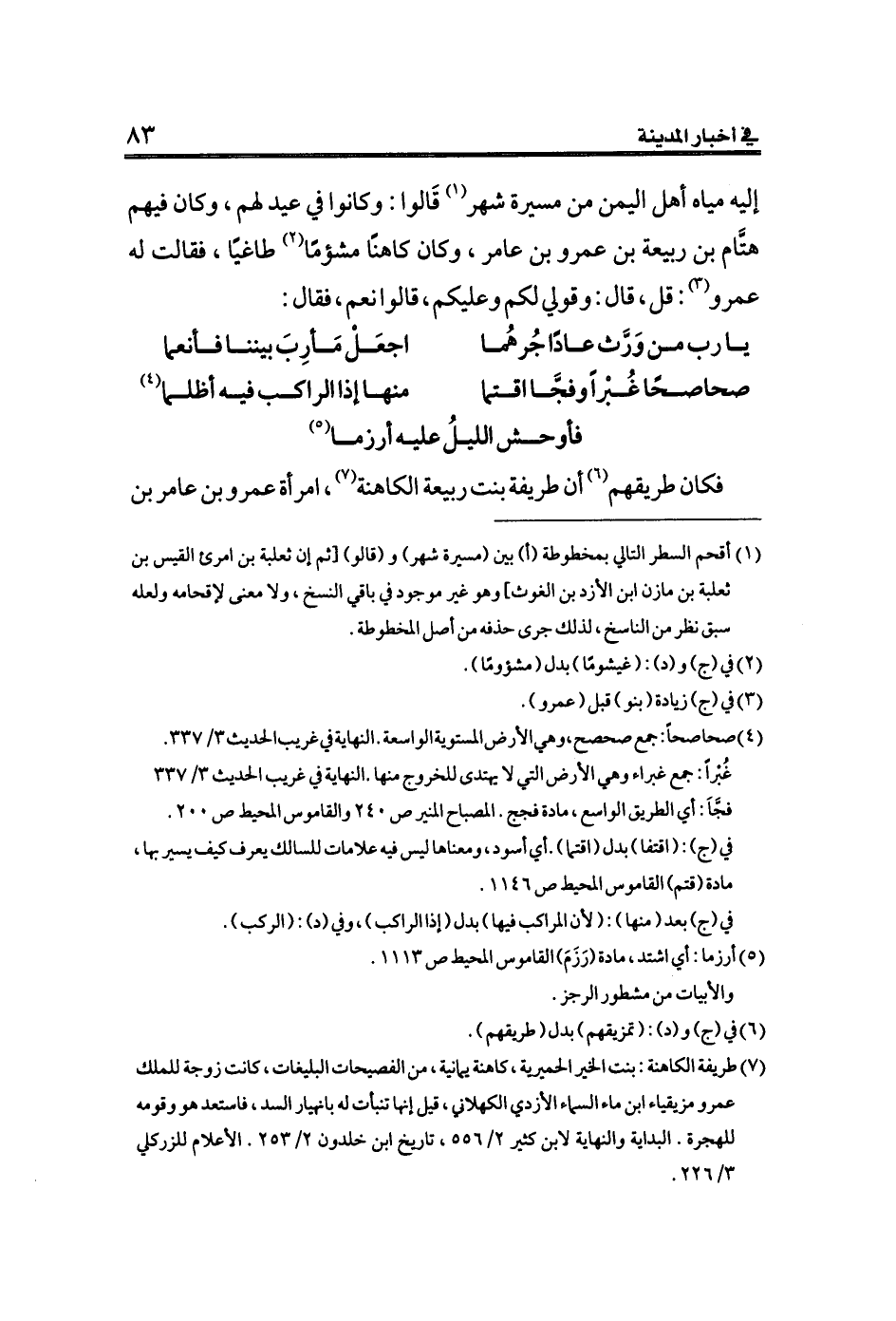 (¬٧) طريفة الكاهنة: بنت الخير الحميرية، كاهنة يمانية، من الفصيحات البليغات، كانت زوجة للملك عمرو مزيقياء ابن ماء السماء الأزدي الكهلاني، قيل إنها تنبأت له بانهيار السد، فاستعد هو وقومه للهجرة. البداية والنهاية لابن كثير ٢/ ٥٥٦، تاريخ ابن خلدون ٢/ ٢٥٣. الأعلام للزركلي ٣/ ٢٢٦.