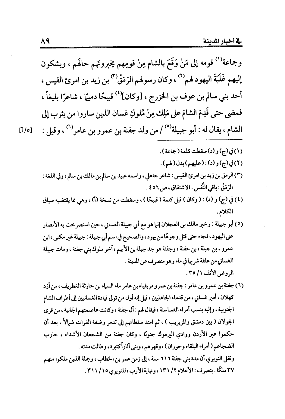 (¬٥) أبو جبيلة: وخبر مالك بن العجلان إنما هو مع أبي جبيلة الغساني، حين استصرخت به الأنصار على اليهود، فجاء حتى قتل وجوهًا من يهود، والصحيح في اسم أبي جبيلة: جبيلة غير مكنى، ابن عمرو، بن جبلة، بن جفنة، وجفنة هو جد جبلة بن الأيهم، آخر ملوك بني جفنة، ومات جبيلة الغساني من علقة شربها في ماء وهو منصرف عن المدينة.