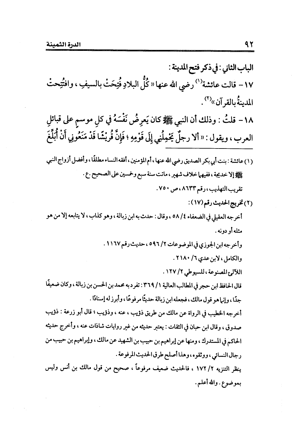 ١٧ - قالت عائشة (¬١) رضي الله عنها ((كُلُّ البلادِ فُتِحَتْ بالسيفِ، وافتُتِحتْ المدينةُ بالقرآن)) (¬٢).