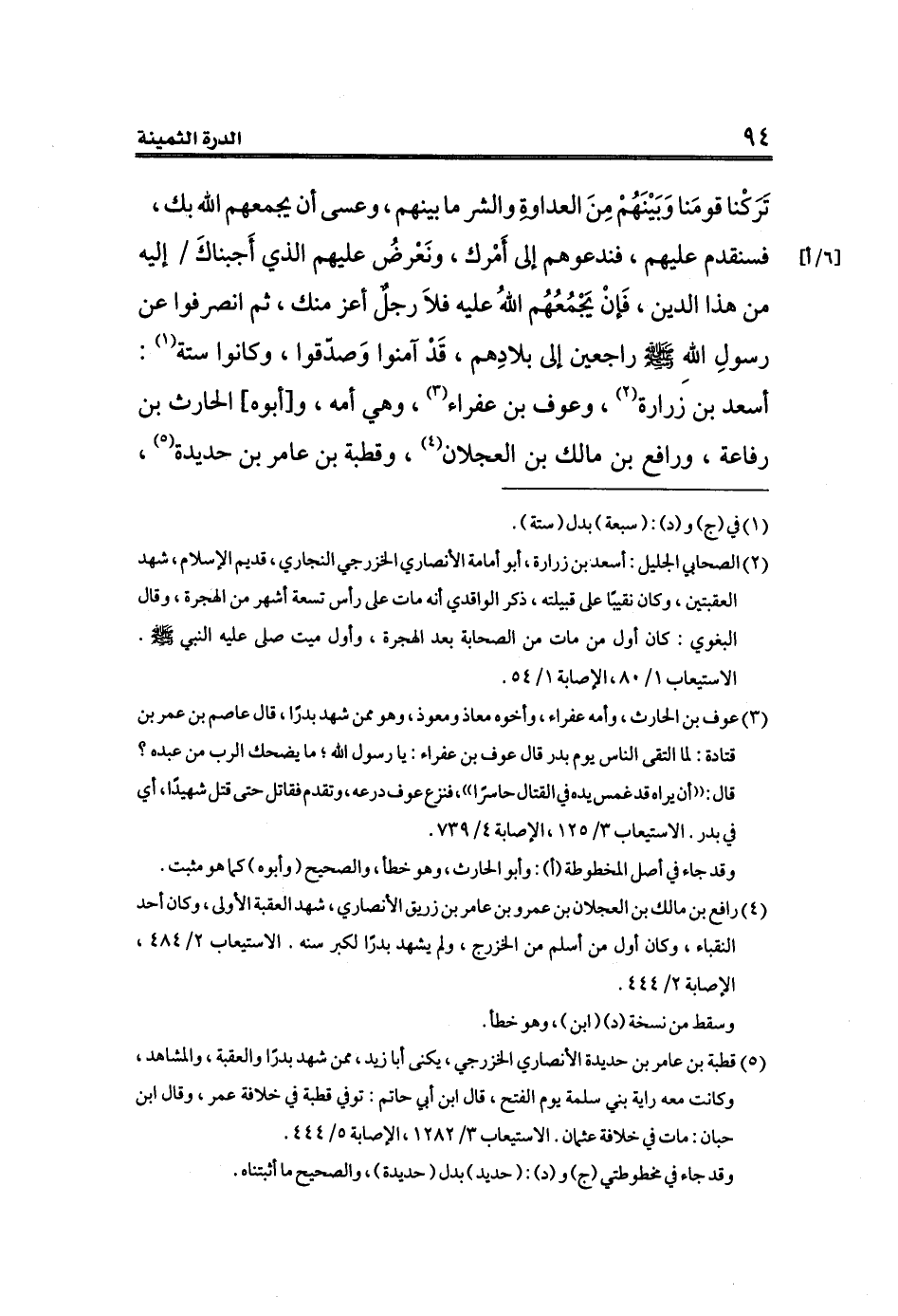 تَرَكْنا قومَنا وَبَيْنَهُمْ مِنَ العداوةِ والشر ما بينهم، وعسى أن يجمعهم الله بك، فسنقدم عليهم، فندعوهم إلى أَمْرك، ونَعْرضُ عليهم الذي أَجبناكَ [٦/أ] إليه من هذا الدين، فَإنْ يَجْمُعُهُم اللهُ عليه فلَا رجلٌ أعز منك، ثم انصرفوا عن رسولِ اللهِ - صلى الله عليه وسلم - راجعين إلى بلادِهم، قَدْ آمنوا وَصدّقوا، وكانوا ستة (¬١): أسعد بن زرارة (¬٢)، وعوف بن عفراء (¬٣)، وهي أمه، و [أبوه] الحارث بن رفاعة، ورافع بن مالك بن العجلان (¬٤)، وقطبة بن عامر بن حديدة (¬٥)،
