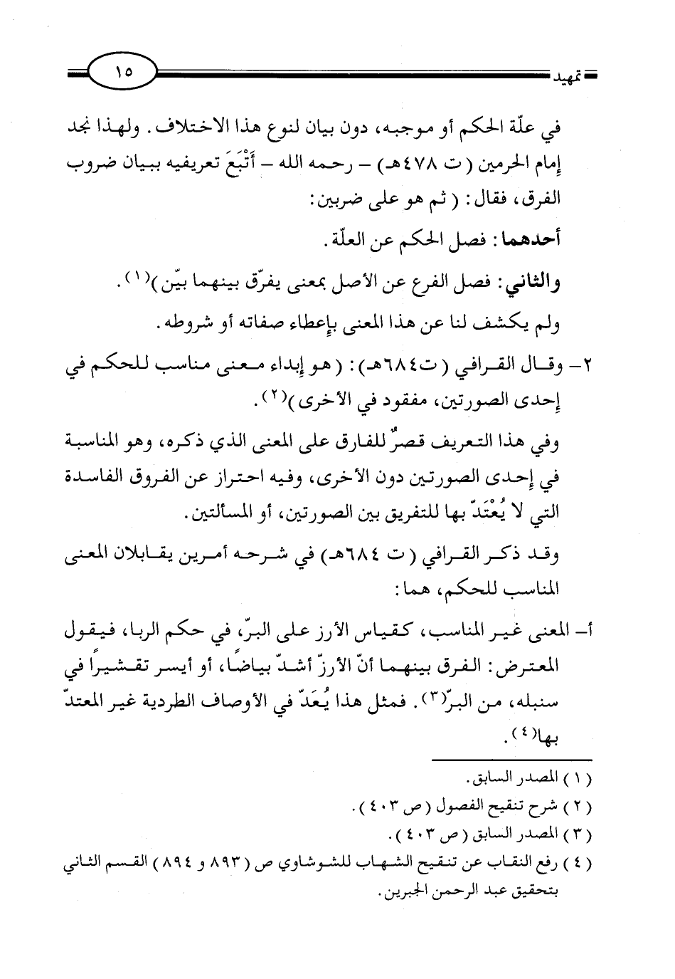 2 - وقال القرافي (ت 684 هـ): (هو إبداء معنى مناسب للحكم في إحدى الصورتين، مفقود في الأخرى) (¬2).