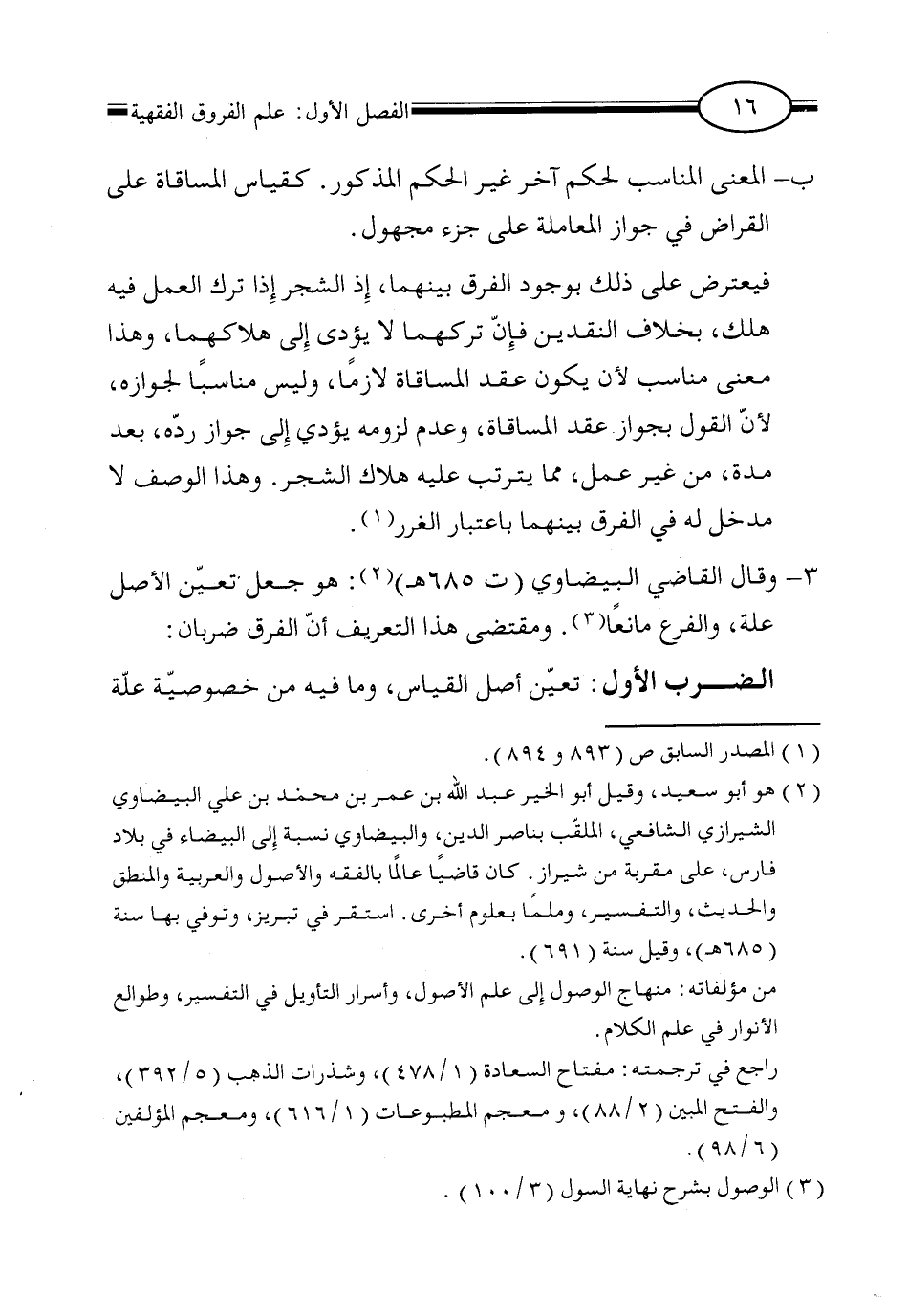 3 - وقال القاضي البيضاوي (ت 685 هـ) (¬2): هو جعل تعيّن الأصل علة، والفرع مانعاً (¬3). ومقتضى هذا التعريف أن الفرق ضربان: