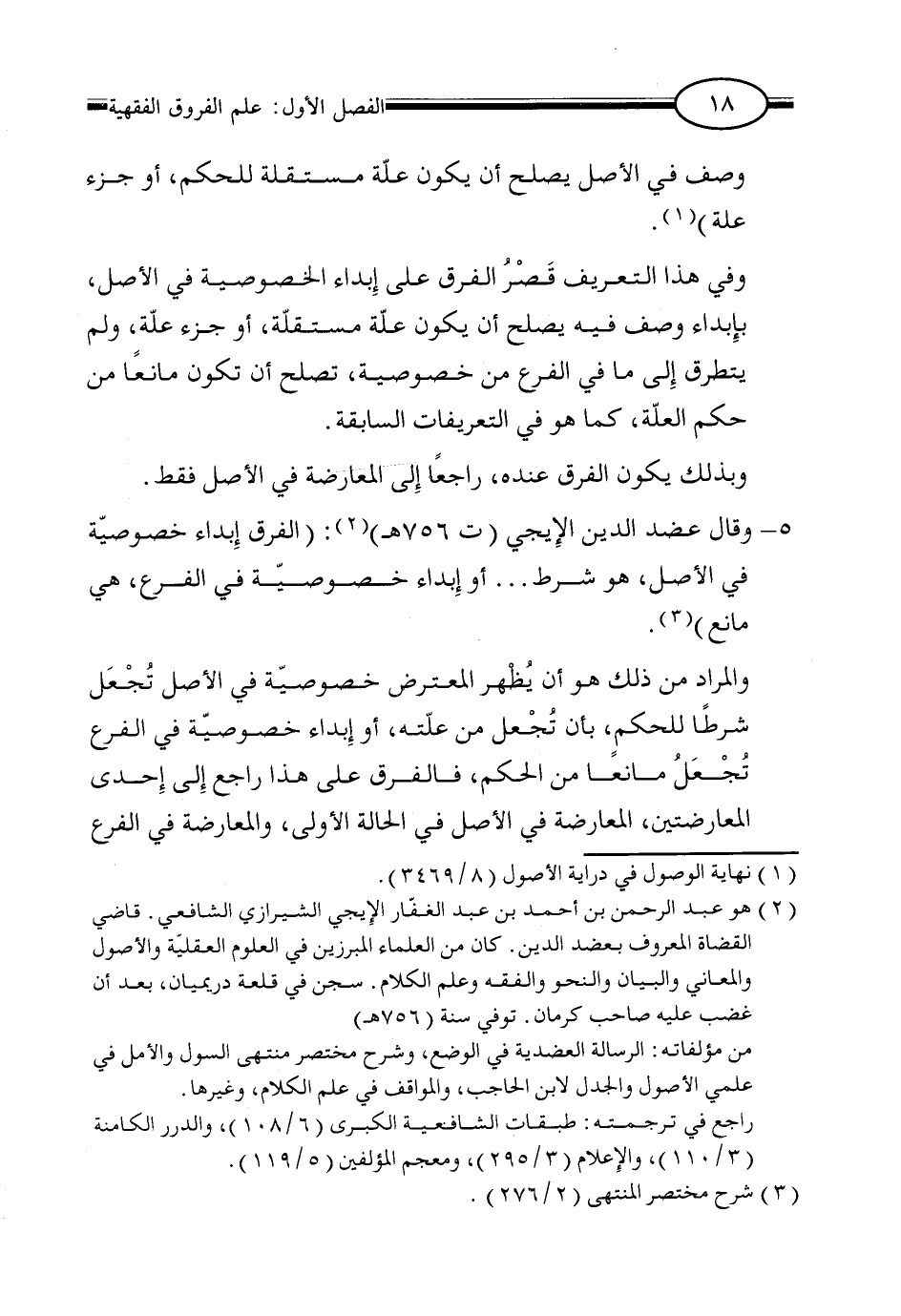 5 - وقال عضد الدين الإيجي (ت 756 هـ) (¬2): (الفرق إبداء خصوصية في الأصل، هو شرط ... أو إبداء خصوصية في الفرع، هي مانع) (¬3).