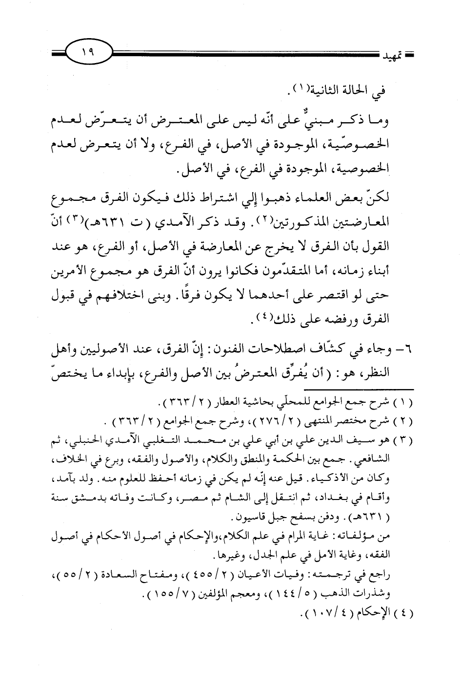 لكن بعض العلماء ذهبوا إلى اشتراط ذلك فيكون الفرق مجموع المعارضتين المذكورتين (¬2). وقد ذكر الآمدي (ت 631 هـ) (¬3) أن القول بأن الفرق لا يخرج عن المعارضة في الأصل، أو الفرع، هو عند أبناء زمانه، أما المتقدمون فكانوا يرون أن الفرق هو مجموع الأمرين حتى لو اقتصر على أحدهما لا يكون فرقاً. وبنى اختلافهم في قبول الفرق ورفضه على ذلك (¬4).
