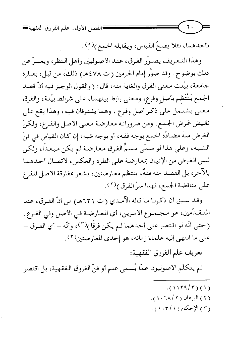 وهذا التعريف يصور الفرق، عند الأصوليين وأهل النظر، ويعبر عن ذلك بوضوح. وقد صوَّر إمام الحرمين (ت 478 هـ) ذلك، من قبل، بعبارة جامعة، بيّنت معنى الفرق والغاية منه، قال: (والقول الوجيز فيه أن قصد الجمع يَنْتَظِم بأصلٍ وفرعٍ، ومعنى رابط بينهما، على شرائط بينة، والفرق معنى يشتمل على ذكر أصل وفرع، وهما يفترقان فيه، وهذا يقع على نقيض غرض الجمع. ومن ضروراته معارضة معنى الأصل والفرع، ولكن الغرض منه مضادة الجمع بوجه فقه، أو بوجه شبه، إن كان القياس في فن الشبه، وعلى هذا لو سمى مسمٍّ الفرق معارضة لم يكن مبعداً، ولكن ليس الغرض من الإتيان بمعارضة على الطرد والعكس، لاتصال أحدهما بالآخر، بل القصد منه فقهٌ، ينتظم معارضتين، يشعر بمفارقة الأصل للفرع على مناقضة الجمع، فهذا سرّ الفرق) (¬2).