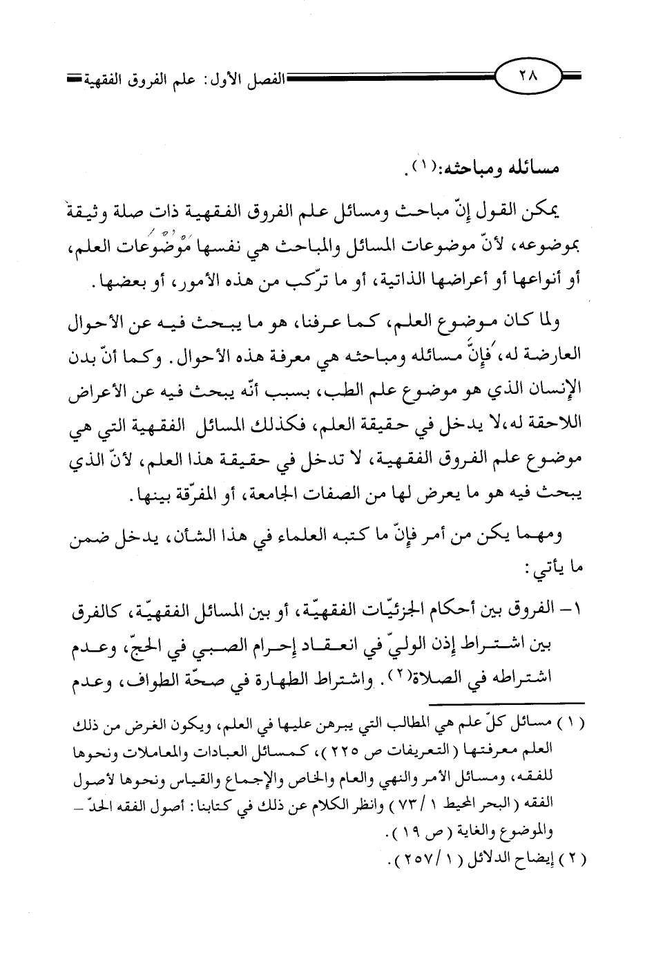 ولما كان موضوع العلم، كما عرفنا، هو ما يبحث فيه عن الأحوال العارضة له، فإنَّ مسائله ومباحثه هي معرفة هذه الأحوال. وكما أن بدن الإنسان الذي هو موضوع علم الطب، بسبب أنه يبحث فيه عن الأعراض اللاحقة له، لا يدخل في حقيقة العلم، فكذلك المسائل الفقهية التي هي موضوع علم الفروق الفقهية، لا تدخل في حقيقة هذا العلم، لأن الذي يبحث فيه هو ما يعرض لها من الصفات الجامعة، أو المفرقة بينها.