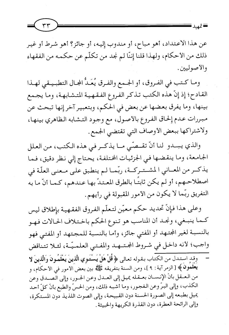 وعلى هذا فإن تحديد حكم معين لتعلم الفروق الفقهية بإطلاق ليس كما ينبغي، ونجد أن المناسب هو تنوع الحكم باختلاف الحالات فهو بالنسبة لغير المجتهد أو المفتي جائز، وأما بالنسبة للمجتهد أو المفتي فهو واجب؛ لأنه داخل في شروط المجتهد والمفتي العلمية، لئلا تتناقض،