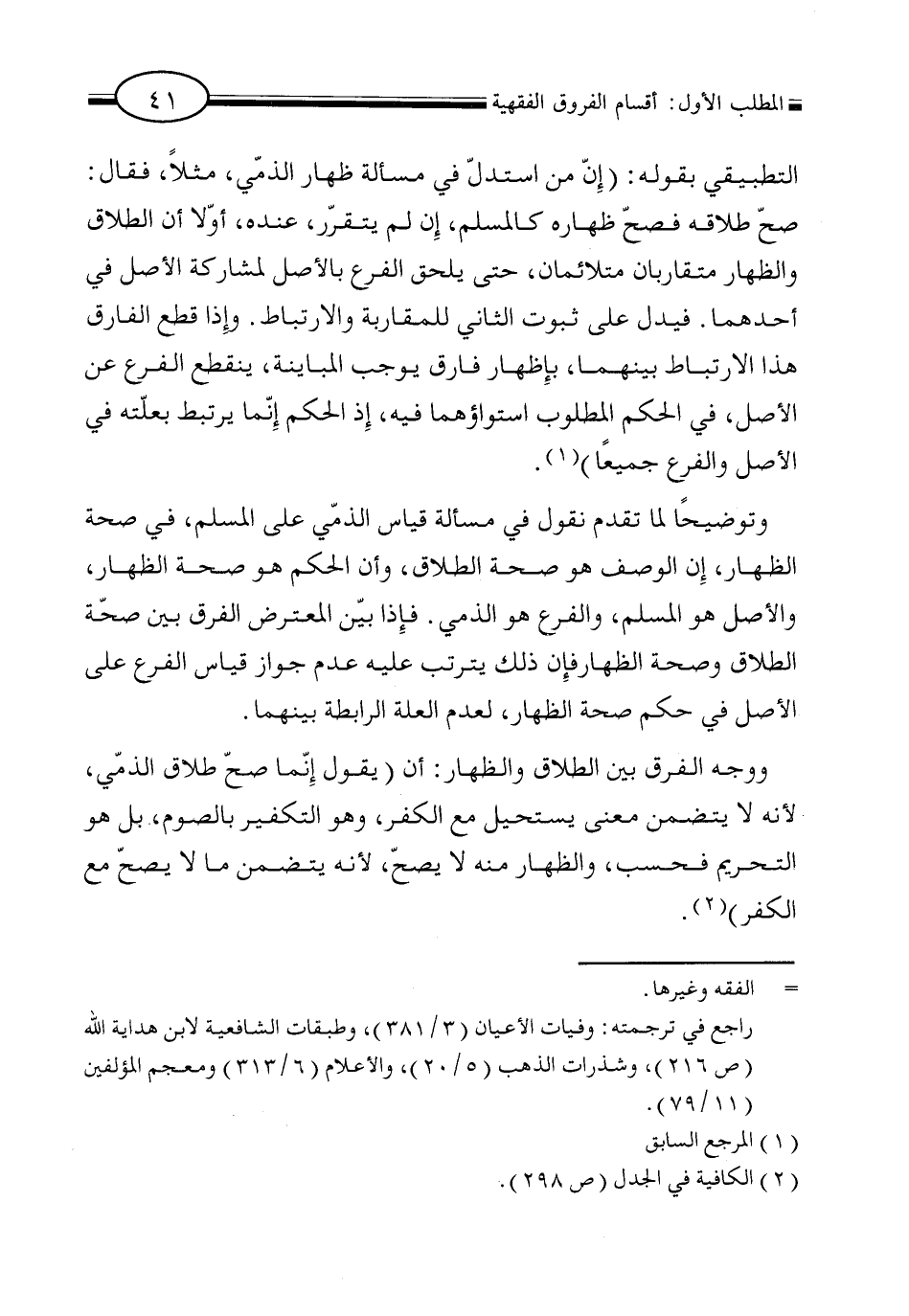 التطبيقي بقوله: (إن من استدل في مسألة ظهار الذمي، مثلاً، فقال: صح طلاقه فصح ظهاره كالمسلم، إن لم يتقرر، عنده، أولاً أن الطلاق والظهار متقاربان متلائمان، حتى يلحق الفرع بالأصل لمشاركة الأصل في أحدهما. فيدل على ثبوت الثاني للمقاربة والارتباط. وإذا قطع الفارق هذا الارتباط بينهما، بإظهار فارق يوجب المباينة، ينقطع الفرع عن الأصل، في الحكم المطلوب استواؤهما فيه، إذ الحكم إنما يرتبط بعلته في الأصل والفرع جميعاً) (¬1).