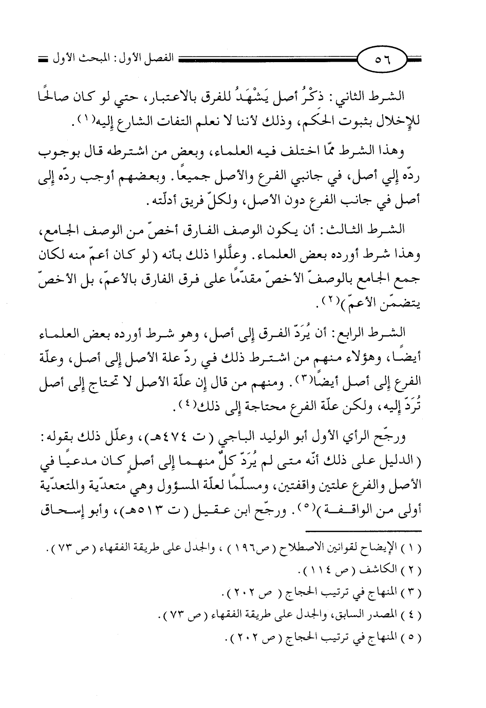 الشرط الرابع: أن يُرد الفرق إلى أصل، وهو شرط أورده بعض العلماء أيضاً، وهؤلاء منهم من اشترط ذلك في رد علة الأصل إلى أصل، وعلة الفرع إلى أصل أيضاً (¬3). ومنهم من قال إن علة الأصل لا تحتاج إلى أصل تُرَد إليه، ولكن علة الفرع محتاجة إلى ذلك (¬4).