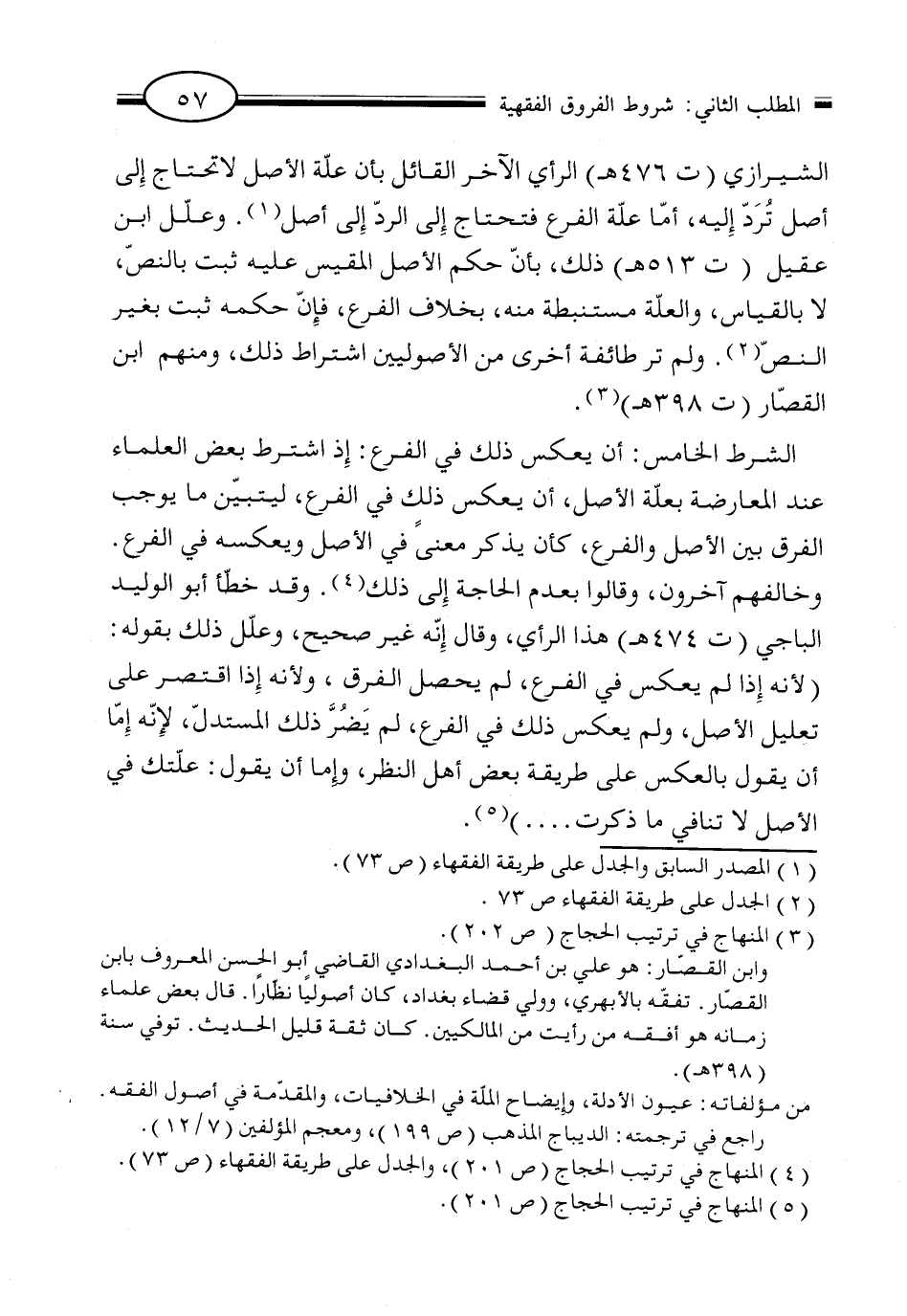 الشيرازي (ت 476 هـ) الرأي الآخر القائل بأن علة الأصل لا تحتاج إلى أصل تُرَد إليه، أما علة الفرع فتحتاج إلى الرد إلى أصل (¬1). وعلل ابن عقيل (ت 513 هـ) ذلك، بأن حكم الأصل المقيس عليه ثبت بالنص، لا بالقياس، والعلة مستنبطة منه، بخلاف الفرع، فإن حكمه ثبت بغير النص (¬2). ولم تر طائفة أخرى من الأصوليين اشتراط ذلك، ومنهم ابن القصّار (ت 398 هـ) (¬3).