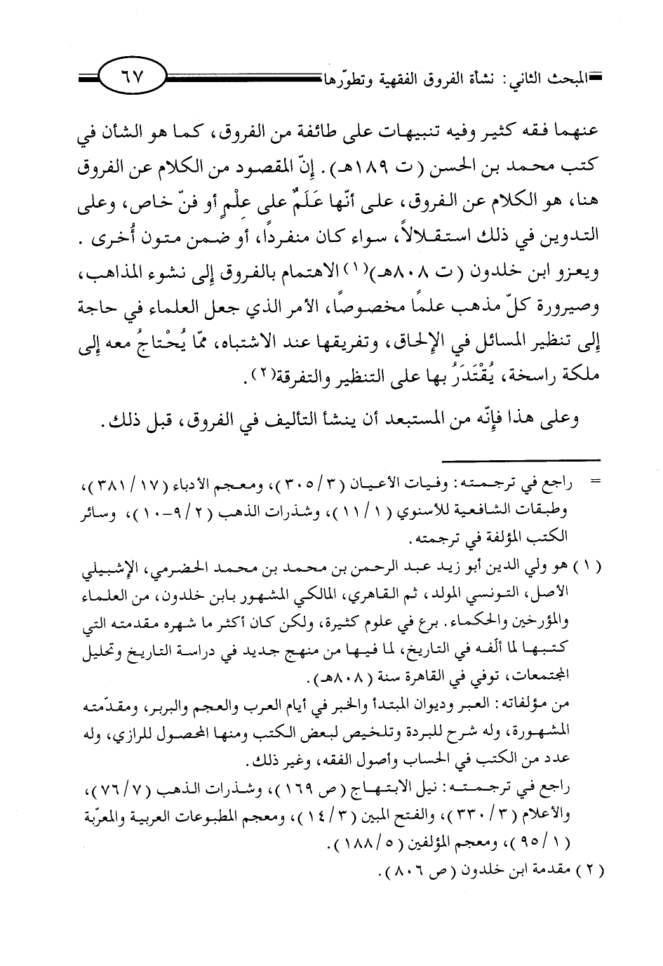 عنهما فقه كثير وفيه تنبيهات على طائفة من الفروق، كما هو الشأن في كتب محمد بن الحسن (ت 189 هـ). إن المقصود من الكلام عن الفروق هنا، هو الكلام عن الفروق، على أنها عَلَمٌ على عِلْمٍ أو فن خاص، وعلى التدوين في ذلك استقلالاً، سواء كان منفرداً، أو ضمن متون أخرى. ويعزو ابن خلدون (ت 808 هـ) (¬1) الاهتمام بالفروق إلى نشوء المذاهب، وصيرورة كلّ مذهب علماً مخصوصاً، الأمر الذي جعل العلماء في حاجة إلى تنظير المسائل في الإلحاق، وتفريقها عند الاشتباه، مما يُحتاجُ معه إلى ملكة راسخة، يُقْتَدَرُ بها على التنظير والتفرقة (¬2).