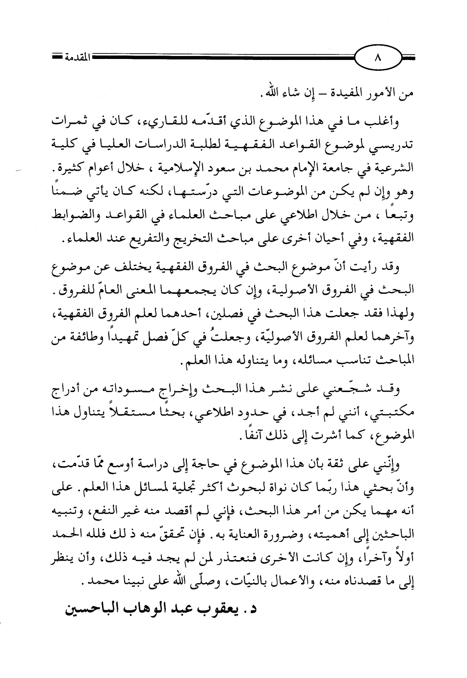 وأغلب ما في هذا الموضوع الذي أقدّمه للقاريء، كان في ثمرات تدريسي لموضوع القواعد الفقهية لطلبة الدراسات العليا في كلية الشريعة في جامعة الإِمام محمَّد بن سعود الإِسلامية، خلال أعوام كثيرة.