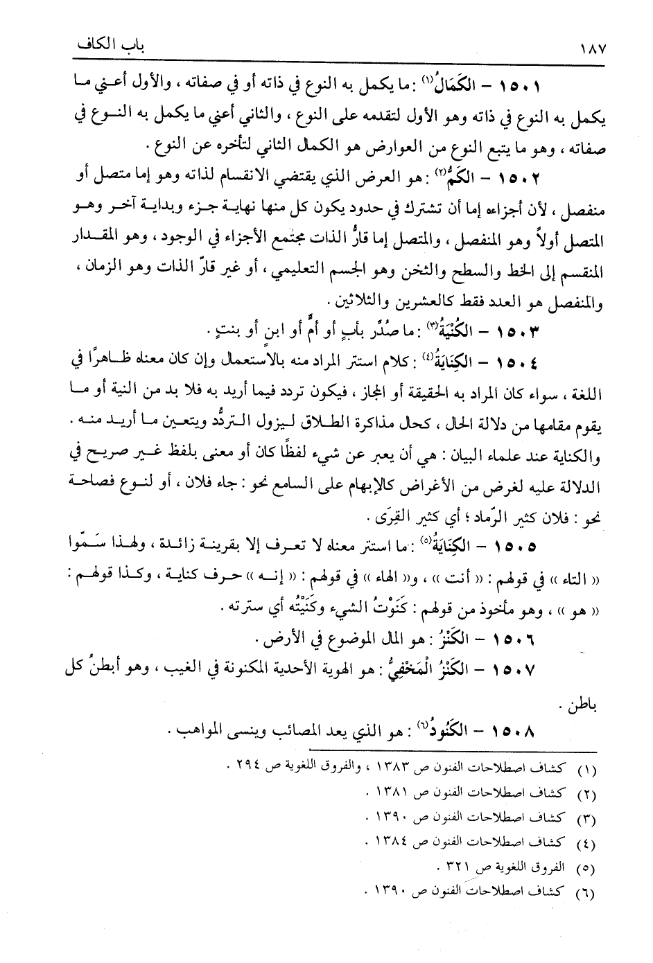 الكمال: ما يكمل به النوع في ذاته، أو صفاته، والأول، أعني ما يكمل به النوع في ذاته، وهو الأول، لتقدمه على النوع، والثاني، أعني ما يكمل به النوع في صفاته، وهو ما يتبع النوع من العوارض، وهو الكمال الثاني؛ لتأخره عن النوع.