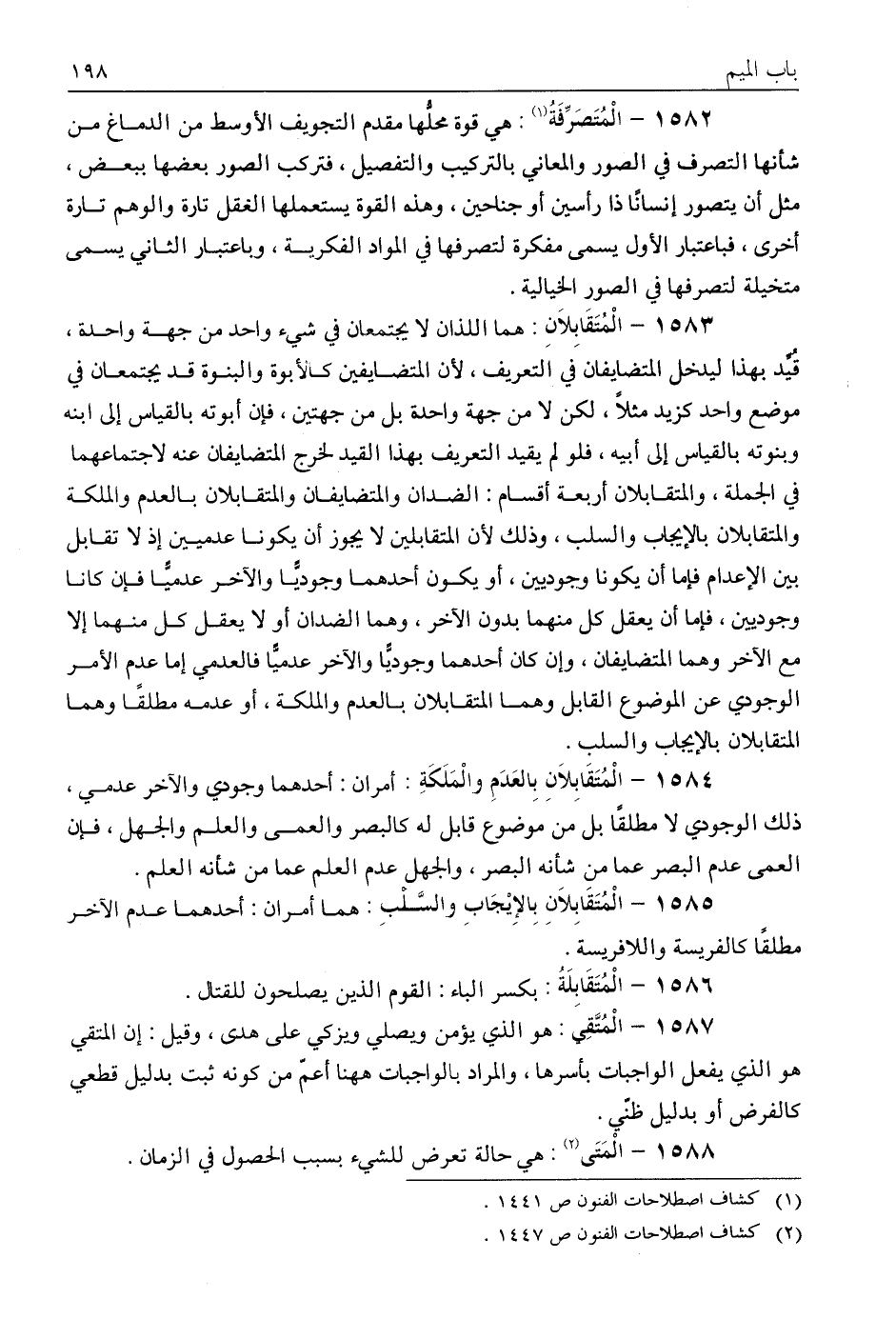 المتقابلان بالعدم والملكة: أمران أحدهما وجودي والآخر عدمي، وذلك الوجودي لا مطلقًا بل من موضوع قابل له، كالبصر والعمى، والعلم والجهل، فإن العمة عدم البصر عما من شأنه البصر، والجهل عدم العلم عما من شأنه العلم.