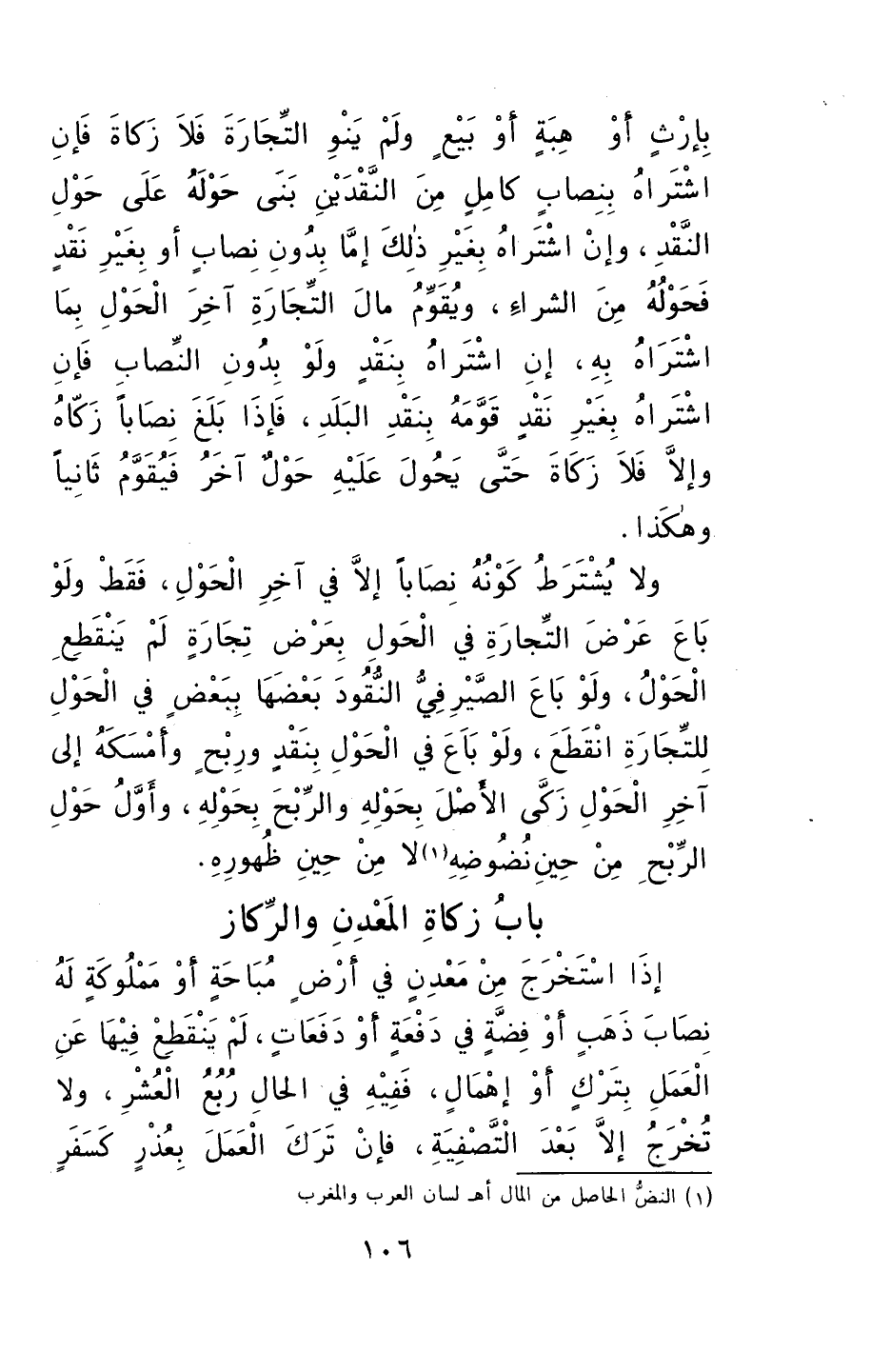 إذا استُخرِجَ من معدنٍ في أرضٍ مباحةٍ أوْ مملوكةٍ لهُ نصابُ ذهبٍ أوْ فضةٍ، في دفعةٍ أوْ دفعاتٍ، لمْ ينقطعْ فيها عن العملِ بتركٍ أوْ إهمالٍ، ففيهِ في الحالِ ربعُ العُشْرِ، ولا تُخرَجُ إلا بعدَ التصفيةِ، فإنْ تركَ العملَ بعذرٍ كسفرٍ