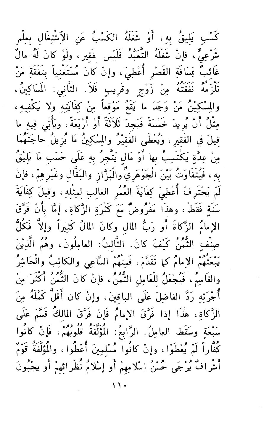 ويعطى الفقيرُ والمسكينُ ما يزيلُ حاجتَهُما منْ عدَّةٍ يكتسبُ بها، أوْ مالٍ يتّجرُ بهِ على حسبِ ما يليقُ بهِ، فيتفاوتُ بينَ الجوهريِّ والبزازِ والبقالِ وغيرهم، فإن لم يحترف أُعطيَ كفايةَ العمرِ الغالبِ لمثلهِ، وقيلَ كفايةَ سنةٍ فقطْ، وهذا مفروضٌ معَ كثرةِ الزكاةِ، إما بأنْ فرَّقَ الإمامُ الزكاةَ، أوْ ربُّ المالِ وكانَ المالُ كثيراً، وإلا فلكلِّ صنفٍ الثمُنُ كيفَ كان. الثالثُ: العاملون: