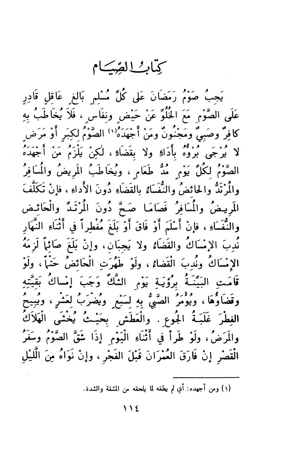 يجبُ صومُ رمضانَ على كلِّ: مسلمٍ بالغٍ عاقلٍ قادرٍ على الصومِ، معَ الخلوِّ عن حيضٍ ونفاسٍ. فلا يخاطبُ بهِ كافرٌ وصبيٌّ ومجنونٌ، ومنْ أجهدهُ الصومُ لكبرٍ أوْ مرضِ لا يرجى برؤه، بأداءِ ولا بقضاءٍ، لكنْ يلزمُ منْ أجهدهُ الصومُ لكلِّ يومٍ مدُّ طعامٍ، ويخاطبُ المريضُ والمسافرُ والمرتدُّ والحائضُ والنفساءُ بالقضاءِ دونَ الأداءِ، فإنْ تكلفَ المريضُ والمسافرُ فصاما صحَّ، دونَ المرتدِّ والحائضِ والنفساءِ. فإن أسلمَ أوْ أفاق أو بلغَ مفطراً في أثناءِ النهارِ نُدبَ الإمساكُ والقضاءُ ولا يجبانِ، وإنْ بلغَ صائماً لزمهُ الإمساكُ ونُدب القضاءُ، ولوْ طهُرَتِ الحائضُ أمسكتْ نَدباً وقضتْ حتماً، أوْ قدمَ المسافرُ أوْ برئَ المريضُ وهما مفطرانِ، أمسكا ندباً وقضيا حتماً، أو صائمانِ أمسكا حتماً.