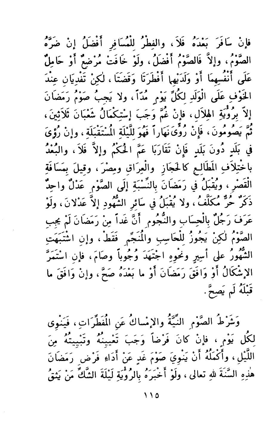 ولا يجبُ صومُ رمضانَ إلا برؤيةِ الهلالِ، فإنْ غمَّ وجبَ استكمالُ شعبانَ ثلاثينَ ثمَّ يصومونَ، فإنْ رؤيَ نهاراً فهوَ لليلةِ المستقبَلةِ، وإنْ رؤيَ في بلدٍ دونَ بلدٍ فإنْ تقاربا عمَّ الحكمُ، وإلا فلا، والبعدُ باختلافِ المطالعِ كالحجازِ والعراقِ ومصرَ، وقيلَ بمسافةِ القصرِ، ويقبلُ في رمضانَ بالنسبةِ إلى الصومِ عدلٌ واحدٌ، ذكرٌ حرٌّ مكلفٌ، ولا يقبلُ في سائرِ الشهورِ إلا عدلانِ، ولوْ عرَفَ رجلٌ بالحسابِ والنجومِ أنَّ غداً منْ رمضانَ لمْ يجب الصومُ، لكنْ يجوزُ للحاسبِ والمنَجِّمِ فقطْ، وإنِ اشتبهتِ الشهورُ على أسيرٍ ونحوهِ اجتهدَ وجوباً وصامَ، فإنِ استمرَّ الإشكالُ أوْ وافقَ رمضانَ أوْ ما بعدهُ صحَّ، وإنْ وافقَ ما قبلهُ لمْ يصحَّ.