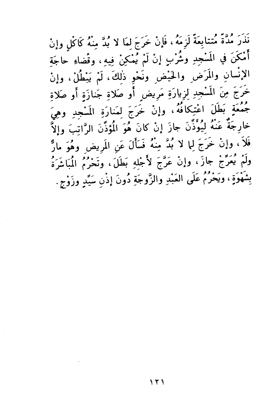 نذرَ مدةً متتابعةً لزمهُ، فإنْ خرجَ لما لا بدَّ منهُ كأكلٍ وإنْ أمكنَ في المسجدِ، وشربٍ إنْ لمْ يمكنْ فيهِ، وقضاءِ حاجةِ الإنسانِ، والمرضِ والحيضِ ونحوِ ذلكَ لمْ يبطلْ، وإنْ خرجَ منَ المسجدِ لزيارةِ مريضٍ، أوْ صلاةِ جنازةٍ أوْ صلاةِ جمعةٍ، بطَلَ اعتكافُهُ، وإنْ خرجَ لمنارةِ المسجدِ وهي خارجةٌ عنهُ ليؤذِّنَ جازَ إنْ كانَ هوَ المؤذنُ الراتبُ، وإلا فلا، وإنْ خرجَ لما لا بدَّ منهُ فسألَ عنِ المريضِ وهوَ مارٌّ ولمْ يعرِّجْ جازَ، وإنْ عرَّجَ لأجلِهِ بطلَ.