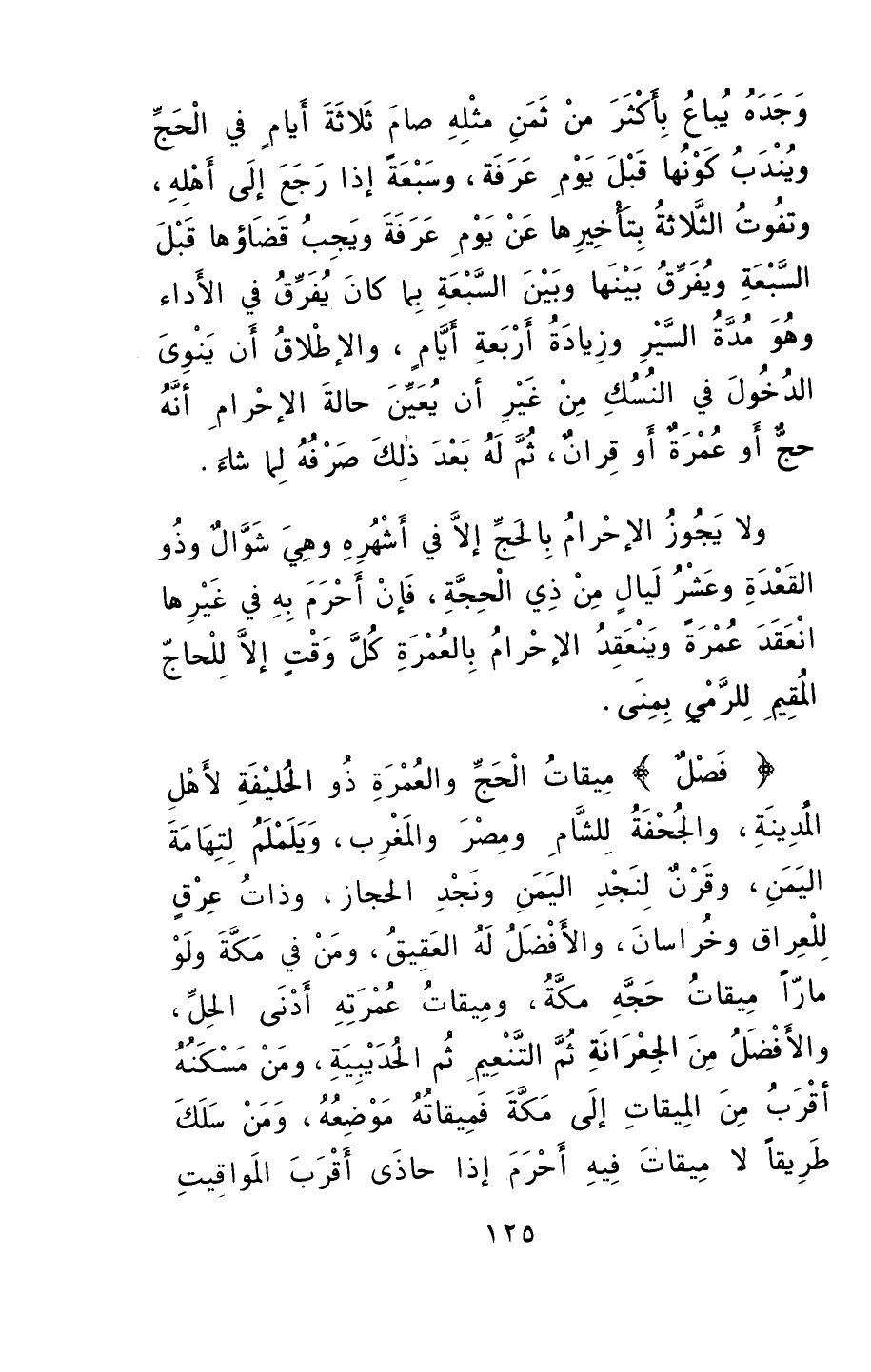 ولا يجوزُ الإحرامُ بالحجِّ إلا في أشهرهِ وهيَ: شوالٌ وذو القَعْدَةِ وعشْرُ ليالٍ منْ ذي الحجَّةِ، فإنْ أحرَمَ بهِ في غيرها انعقدَ عمرةً، وينعقدُ الإحرامُ بالعمرةِ كلَّ وقتٍ إلا للحاجِّ المقيمِ للرميِ بمنى.