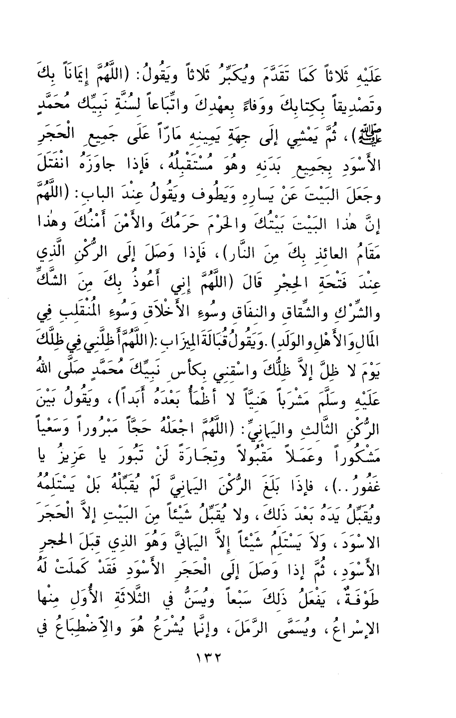 ثمَّ يمشي إلى جهةِ يمينهِ، ماراً على جميعِ الحَجَرِ الأسودِ بجميعِ بدنهِ وهوَ مستقبلُهُ، فإذا جاوزهُ انفتلَ وجعلَ البيتَ عنْ يسارهِ، ويطوفُ ويقولُ عندَ البابِ: اللهمَّ إنَّ هذا البيتَ بيتكَ والحرم حرمكَ والأمن أمنكَ وهذا مقامُ العائذِ بكَ منَ النارِ.