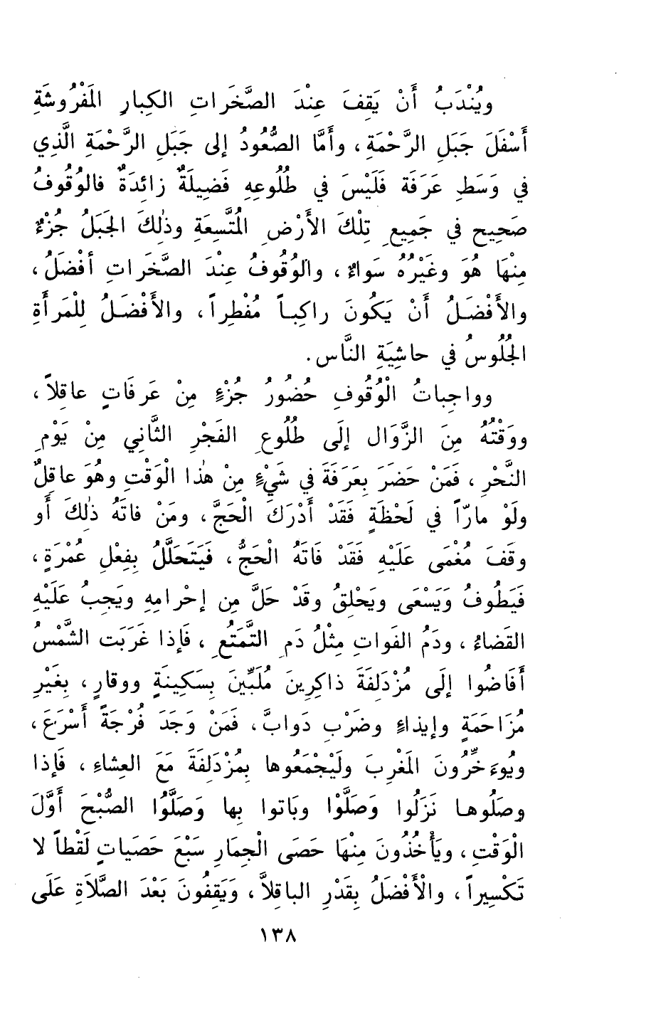 ويندبُ أنْ يقفَ عندَ الصَخَراتِ الكبارِ المفروشةِ أسفلَ جبلِ الرحمةِ، وأما الصعودُ إلى جبلِ الرحمةِ الذي في وسطِ عرفةَ فليسَ في طلوعهِ فضيلةٌ زائدةٌ، فالوقوفُ صحيحٌ في جميعِ تلكَ الأرضِ المتسعةِ وذلكَ الجبلُ جزءٌ منها هو وغيرُهُ سواءٌ، والوقوف عند الصخرات أفضل، والأفضلُ للمرأةِ الجلوسُ في حاشيةِ الناس.
