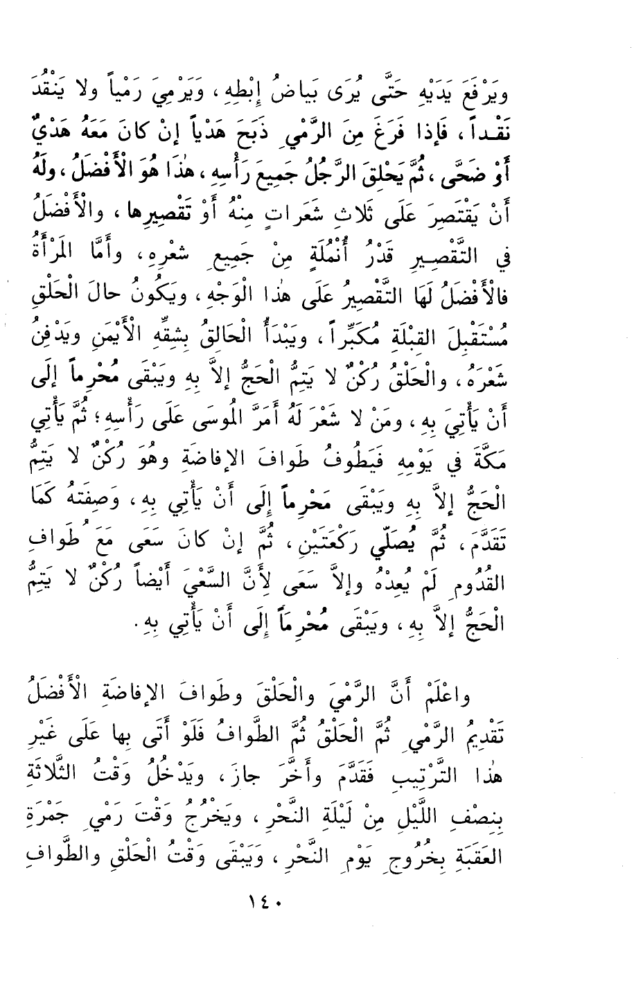فإذا فرغَ منَ الرمي ذبحَ هدْياً إنْ كانَ معهُ هديٌ، أوْ ضحَّى، ثمَّ يحلقُ الرجلُ جميعَ رأسهِ، هذا هوَ الأفضلُ، ولهُ أنْ يقتصرَ على ثلاثِ شعراتٍ منهُ أوْ تقصيرها، والأفضلُ في التقصيرِ قدْرُ أنملةٍ منْ جميعِ شعرهِ، وأما المرأةُ فالأفضلُ لها التقصيرُ على هذا الوجه.