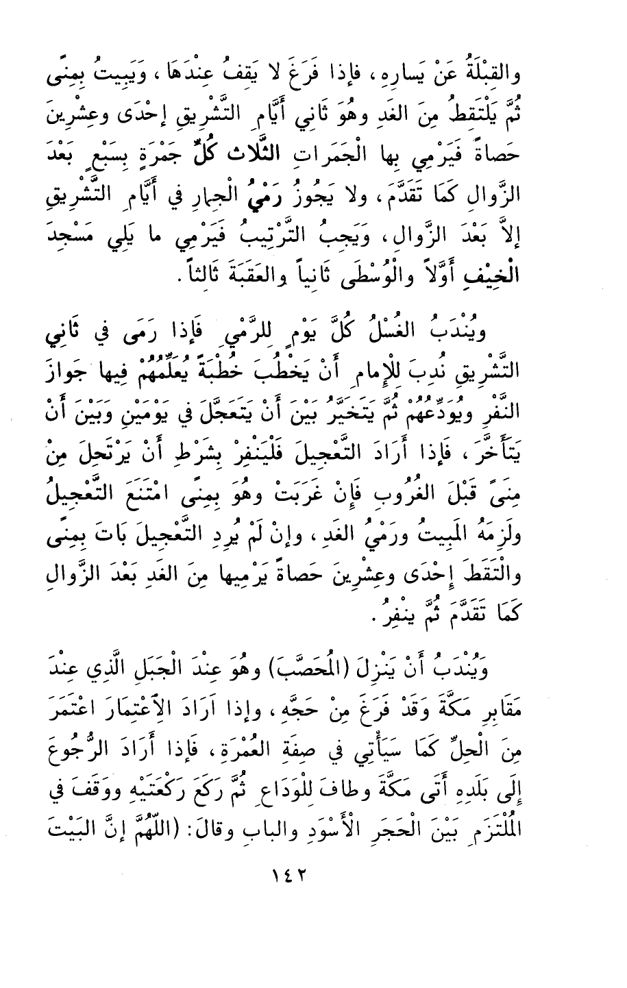 ويندبُ الغُسلُ كلَّ يومٍ للرمي، فإذا رمى في ثاني التشريقِ نُدبَ للإمامِ أنْ يخطبَ خطبةً يعلمهُمْ فيها جوازَ النَفْرِ ويودعُهم، ثمَّ يتخيرُ: بينَ أنْ يتعجلَ في يومينِ، وبينَ أنْ يتأخَّرَ. فإذا أرادَ التعجيلَ فلينفرْ بشرطِ أنْ يرتحلَ منْ منى قبلَ الغروبِ، فإنْ غربتْ وهو بمنى امتنعَ التعجيلُ ولزمهُ المبيتُ ورميُ الغدِ، وإنْ لمْ يرِدِ التعجيلَ باتَ بمنى والتقطَ إحدى وعشرينَ حصاةً يرميها منَ الغدِ بعدَ الزوالِ كما تقدمَ، ثمَّ ينفرُ.