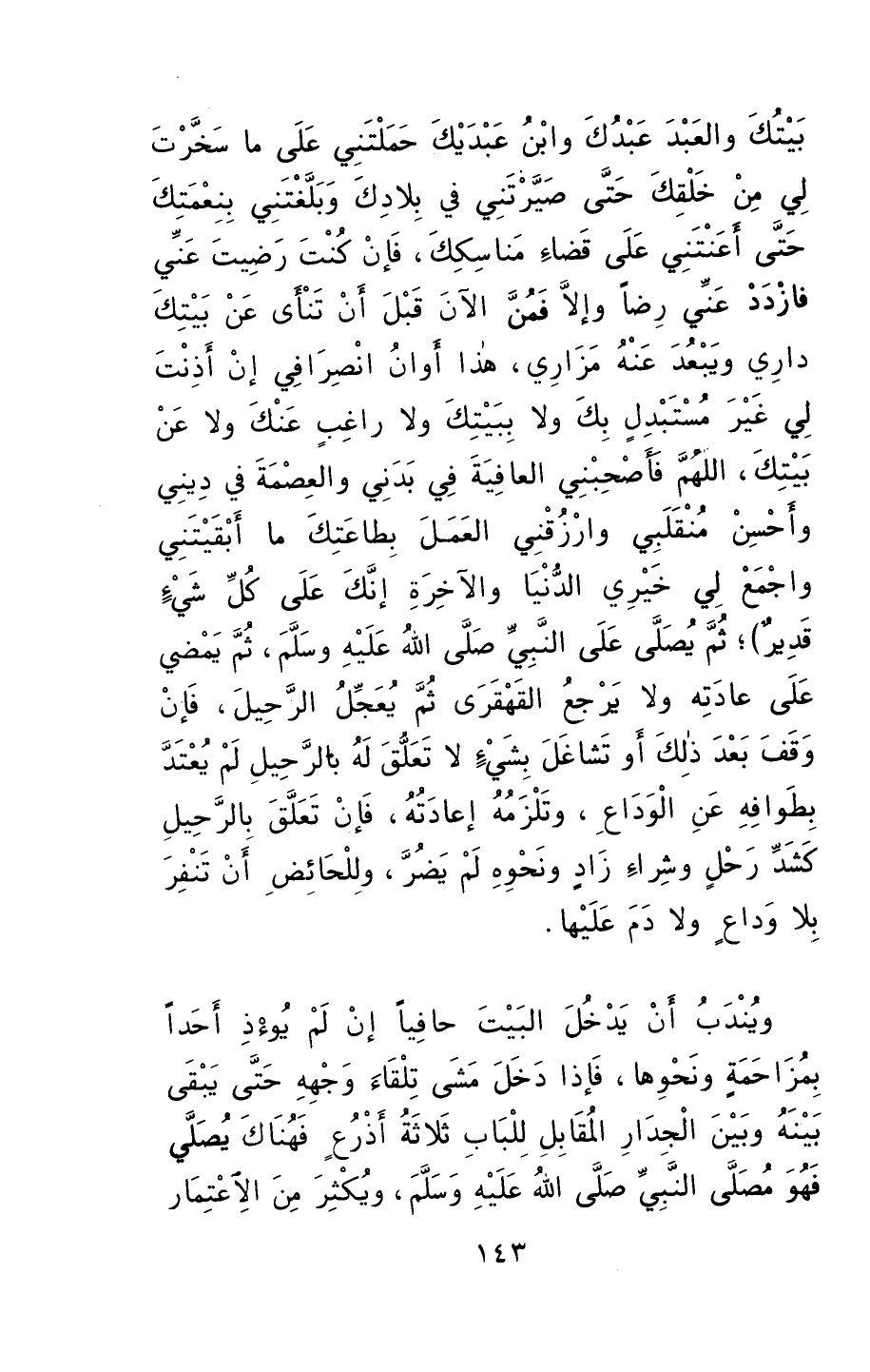 بيتُكَ والعبد عبدكَ وابنُ عبديكَ، حمَلْتني على ما سخَّرْتَ لي منْ خلقكَ حتى صيّرْتني في بلادكَ وبلَّغتني بنعمتكَ حتى أعنْتَني على قضاءِ مناسككَ، فإنْ كنتَ رضيتَ عني فازددْ عني رضاً، وإلا فمُنَّ الآنَ قبلَ أنْ تنأى عنْ بيتكَ داري ويبعُدَ عنهُ مزاري، هذا أوانُ انصرافي إنْ أذِنتَ لي غيرَ مستبدلٍ بكَ ولا ببيتكَ ولا راغبٍ عنكَ ولا عنْ بيتكَ، اللهمَّ فأصحبني العافيةَ في بدني والعصمةَ في ديني، وأحسنْ منقلبي وارزقني العملَ بطاعتكَ ما أبقيتني، واجمعْ لي خيريِ الدنيا والآخرةِ، إنكَ على كلِّ شيءٍ قديرٌ.