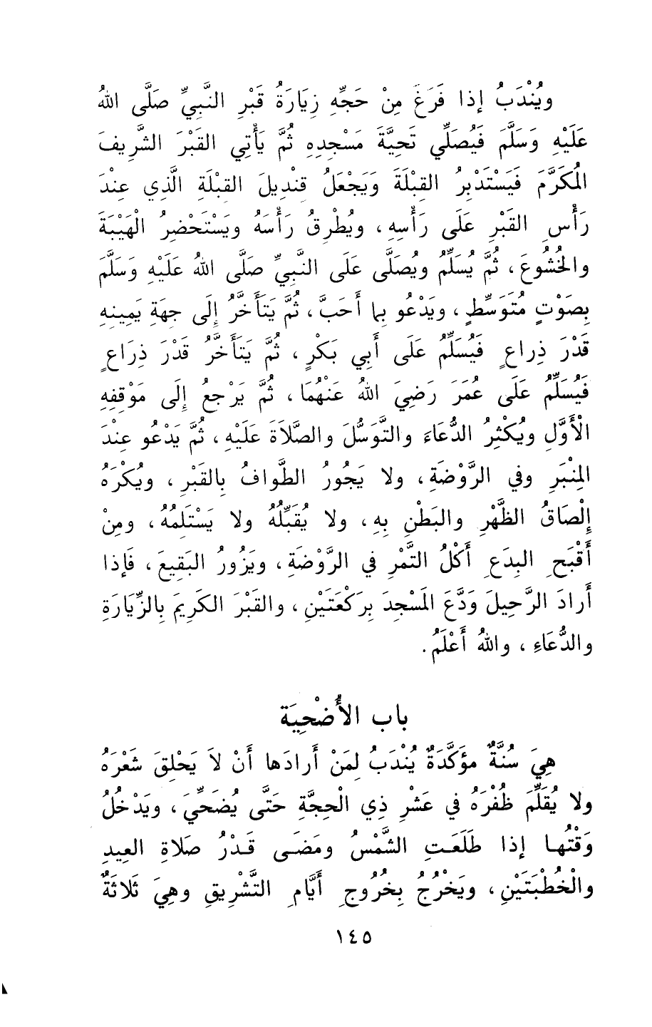 ويُندبُ إذا فرغَ منْ حجهِ زيارةُ قبرِ النبيِّ صلى اللهُ عليه وسلمَ، فيصلي تحيةَ مسجدهِ، ثمَّ يأتي القبرَ الشريفَ المكرَّمَ فيستدبرُ القِبْلةَ ويجعلُ قنديلَ القِبلةِ الذي عندَ رأسِ القبرِ على رأسهِ، ويطرقُ رأسهُ ويستحضرُ الهيبةَ والخشوعَ، ثمَّ يسلمُ ويصلي على النبيِّ صلى الله عليه وسلم بصوتٍ متوسطٍ، ويدعو بما أحبَّ، ثمَّ يتأخرُ إلى جهةِ يمينهِ قدْرَ ذراعٍ فيسلمُ على أبي بكرٍ، ثمَّ يتأخرُ قدرَ ذراعٍ فيسلمُ على عمرَ رضي اللهُ عنهُما، ثمَّ يرجعُ إلى موقفهِ الأولِ ويكثرُ الدعاءَ والتوسلَ والصلاةَ عليهِ، ثمَّ يدعو عندَ المنبرِ، وفي الروضةِ.