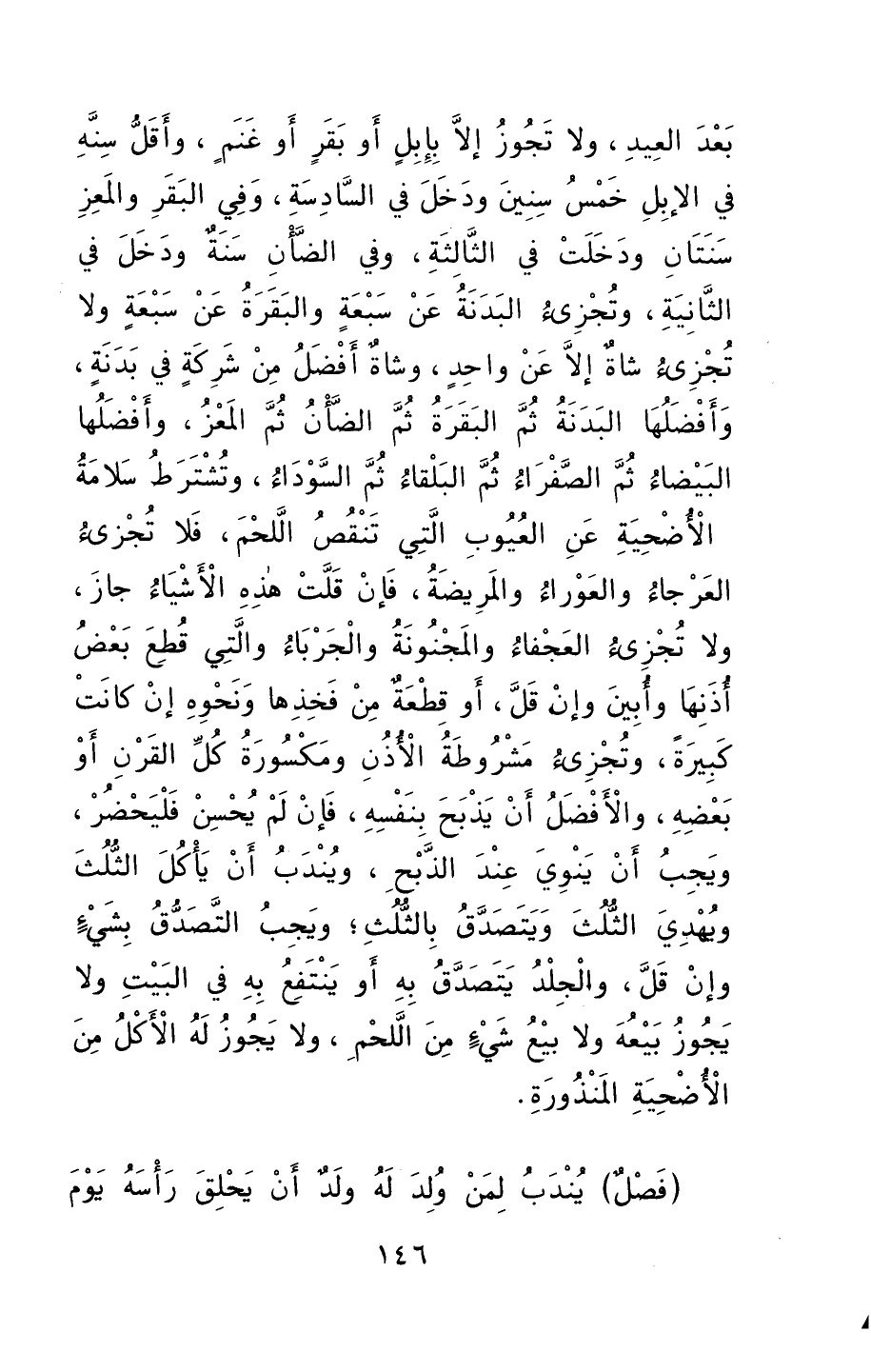ولا تجوزُ إلا بإبلٍِ أوْ بقرٍ أوْ غنمٍ، وأقلُّ سِنِّهِ في الإبلِ خمسُ سنينَ ودخلَ في السادسةِ، وفي البقرِ والمعزِ سنتانِ ودخلتْ في الثالثةِ، وفي الضأنِ سنةٌ ودخلَ في الثانيةِ، وتجزئ البَدَنةُ عنْ سبعةٍ والبقرةُ عنْ سبعةٍ، ولا تجزئ شاةٌ إلا عنْ واحدٍ، وشاةٌ أفضلُ منْ شركةٍ في بَدَنةٍ، وأفضلها البَدَنةُ، ثمَّ البقرةُ، ثمَّ الضأنُ، ثمَّ المعزُ، وأفضلُها البيضاءُ، ثمَّ الصفراءُ، ثمَّ البلقاءُ، ثمَّ السوداءُ.