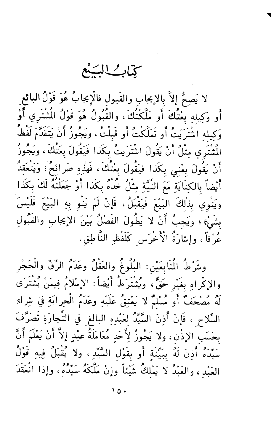 لا يصحُّ البيعُ إلا بالإيجابِ والقَبولِ، فالإيجابُ: هوَ قولُ البائعِ أوْ وكيلهِ: بعتُكَ، أوْ ملَّكتُكَ، والقَبولُ: هوِ قولُ المشتري أوْ وكيلهِ: اشتريتُ، أوْ تملَّكتُ، أوْ قبلتُ.