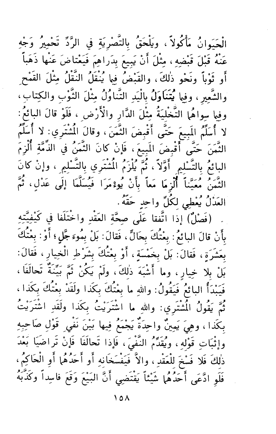 الحيوانُ مأكولاً، ويُلحقُ بالتَّصْريةِ في الردِّ تحميرُ وجهِعنهُ قبلَ قَبْضهِ، مثلَ أنْ يبيعَ بدراهمَ فيعتاضَ عنها ذهباً، أو ثوباً، ونحوَ ذلكَ. والقبضُ فيما يُنقلُ بالنَّقلِ، مثلُ القمحِ والشعيرِ، وفيما يُتناولُ باليدِ التناولُ، مثلُ الثوبِ والكتابِ، وفيما سواهما التخليةُ، مثلُ الدارِ والأرضِ.