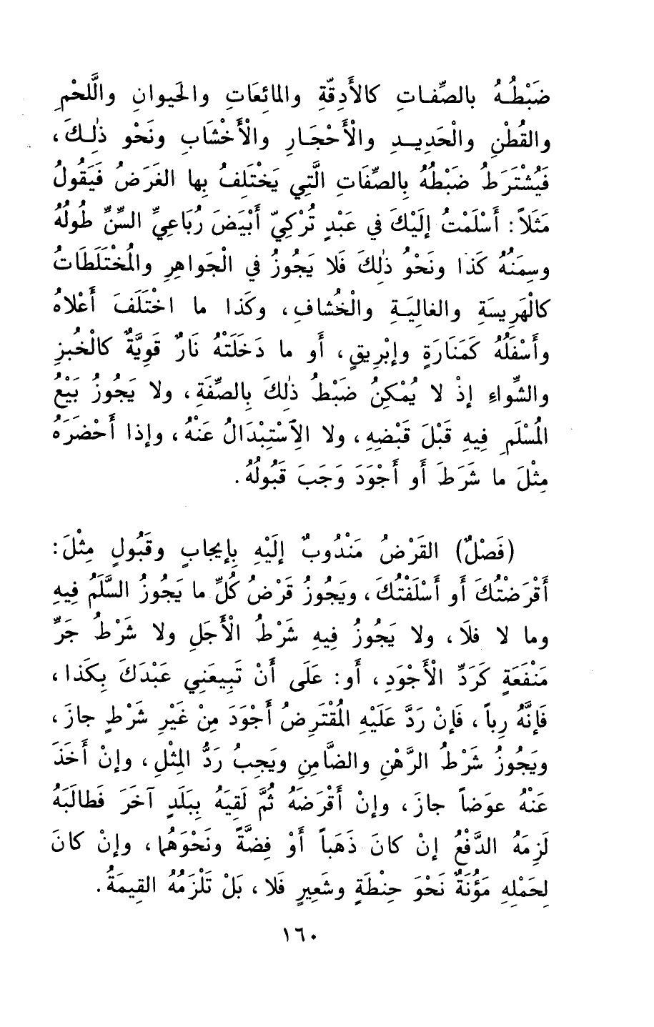 القرضُ مندوبٌ إليهِ بإيجابٍ وقبولٍ، مثلَ: أقرضتُكَ أو أسلفتُكَ، ويجوزُ قرضُ كلِّ ما يجوزُ السَّلَمُ فيهِ، وما لا فلا، ولا يجوزُ فيهِ شرطُ الأجلِ، ولا شرطٌ جرَّ منفعةٍ كرَدِّ الأجودِ، أو على أن تبيعني عبدَك بكذا، فإنهُ ربا، فإنْ ردَّ عليهِ المقترضُ أجودَ من غيرِ شرطٍ جازَ، ويجوزُ شرطُ الرهنِ والضمانِ، ويجبُ ردُّ المِثلِ، وإنْ أخذَ عنه عِوَضاً جازَ.