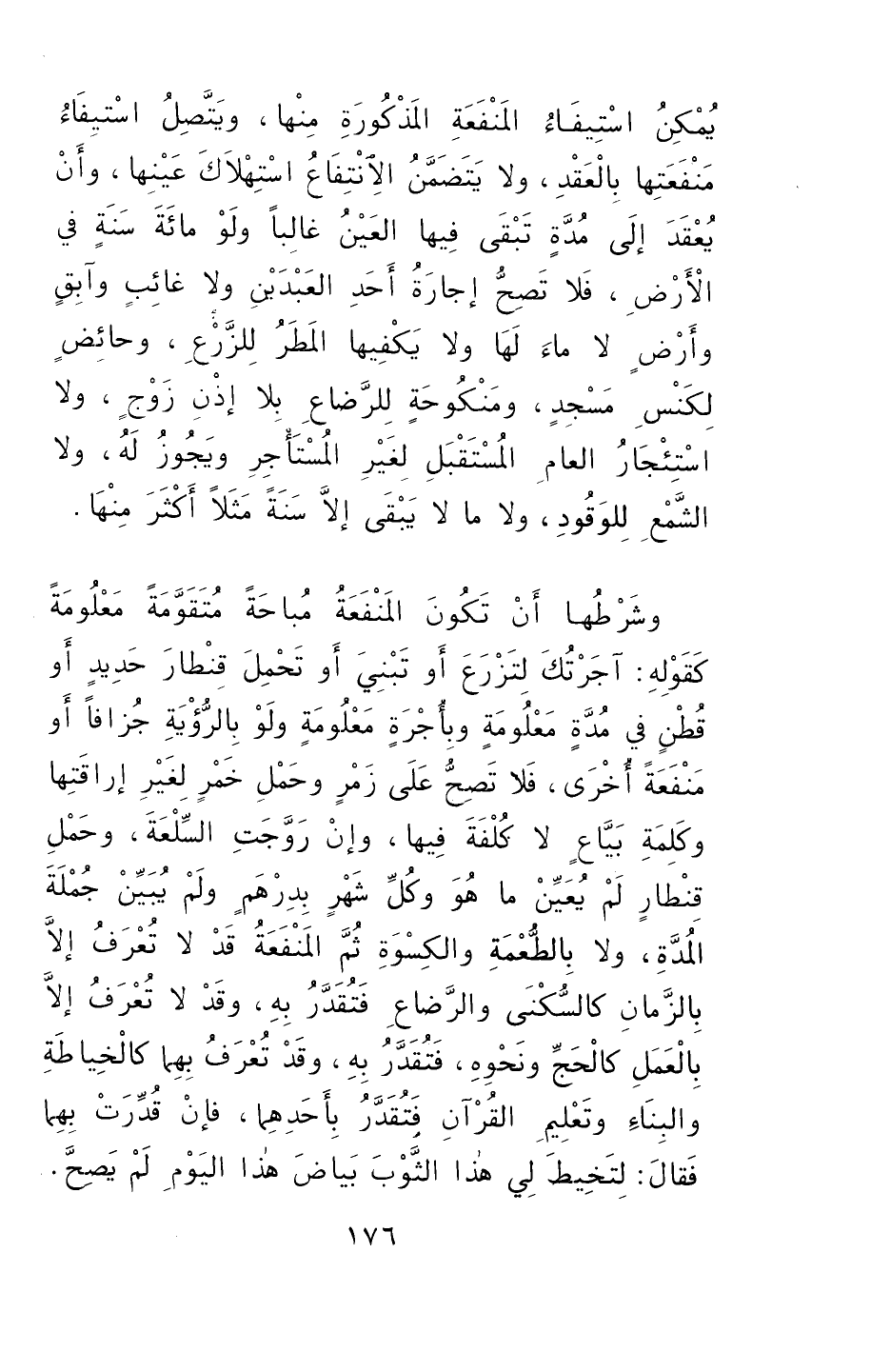 وشرْطُها: أن تكونَ المنفعةُ مباحةً متقومةً معلومةً، كقولهِ: آجرتُكَ لتزرعَ، أو تبْني، أو تحملَ قنطارَ حديدٍ أو قُطنٍ، في مدة معلومةٍ، وبأجرةٍ معلومةٍ، ولو بالرؤيةِ جُزافاً، أو منفعةً أخرى.