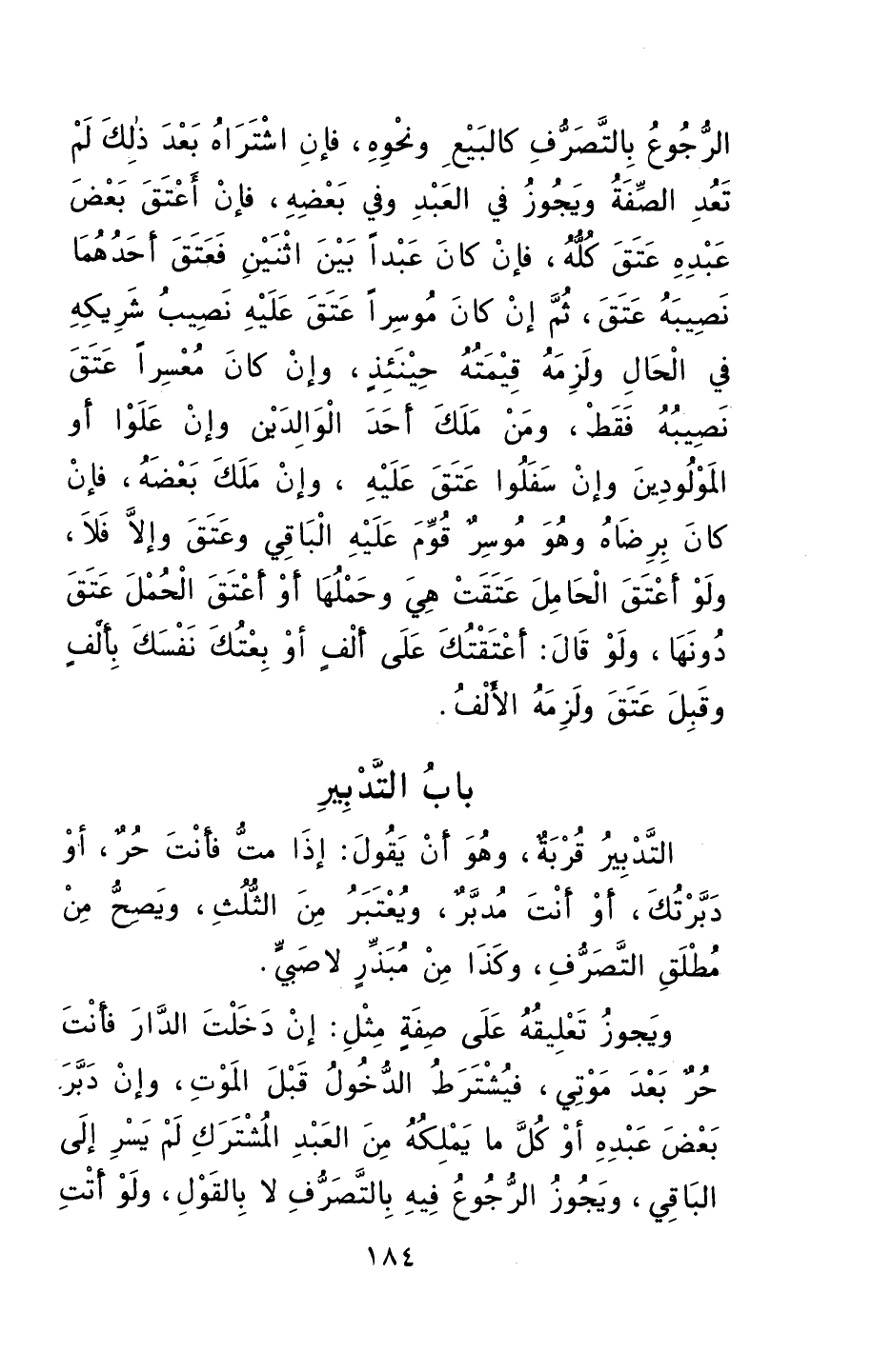التدبيرُ قُرْبَةٌ، وهو أن يقولَ: إذا متُّ فأنتَ حُرٌّ أوْ دبَّرتُك، أوْ أنتَ مدَبَّرٌ. ويعتبرُ منَ الثلُثِ، ويصحُّ منْ مُطلق التصرُفِ وكذا منْ مبذرٍ لا صبيٍّ.
