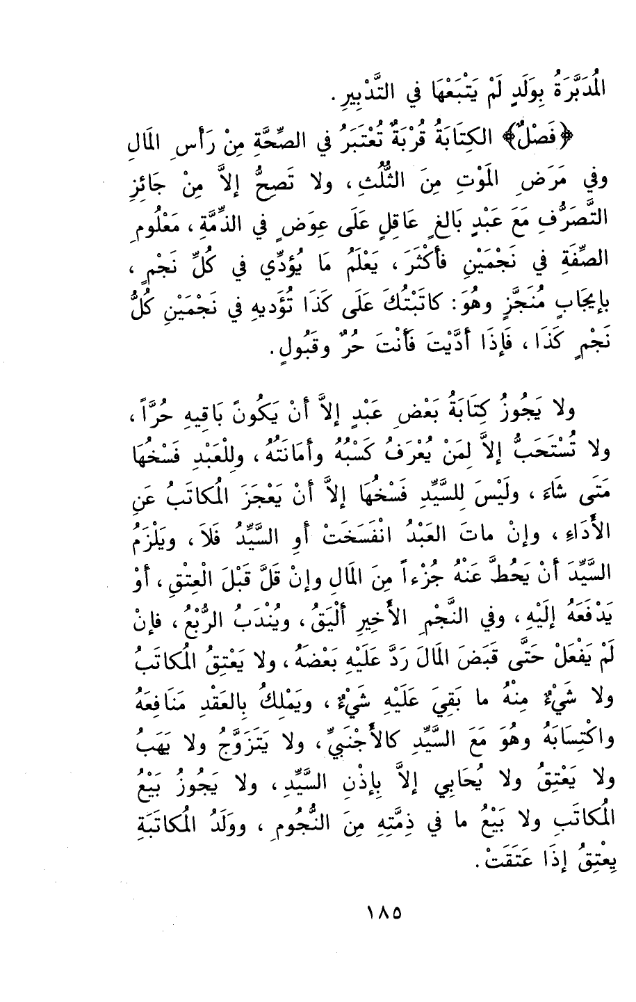 الكتابةُ قربةٌ، تعتبرُ في الصحَّةِ منْ رأسِ المالِ، وفي مرضِ الموتِ منَ الثُلُثِ، ولا تصحُّ إلا منْ جائزِ التصرُفِ، مع عبدٍ بالغٍ عاقلٍ، على عِوَضٍ في الذمةِ، معلومِ الصفةِ، في نَجميْنِ فأكثرَ، يعلمُ ما يؤدي في كلِّ نجمٍ، بإيجاب منجَّزٍ، وهوَ: كاتَبتُكَ على كذا تؤديهِ في نجميْن، كلُّ نجمِ كذا، فإذا أدَّيتَ فأنتَ حُرٌّ. وقَبولٌ.