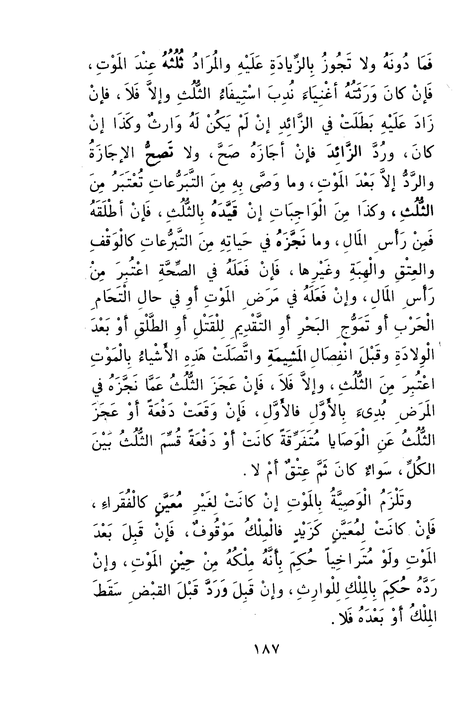 فما دونَهُ، ولا تجوزُ بالزيادةِ عليهِ، والمرادُ ثُلُثَهُ عندَ الموتِ، فإنْ كانَ ورثتُهُ أغنياءَ نُدِبَ استيفاءُ الثُلثِ، وإلا فلا، فإنْ زادَ عليهِ بطلتْ في الزائدِ إنْ لمْ يكنْ لهُ وارثٌ، وكذا إن كان ورُدَّ الزائدُ، فإنْ أجازَهُ صحَّ، ولا تصحُّ الإجازةُ والرَّدُّ إلا بعدَ الموتِ.