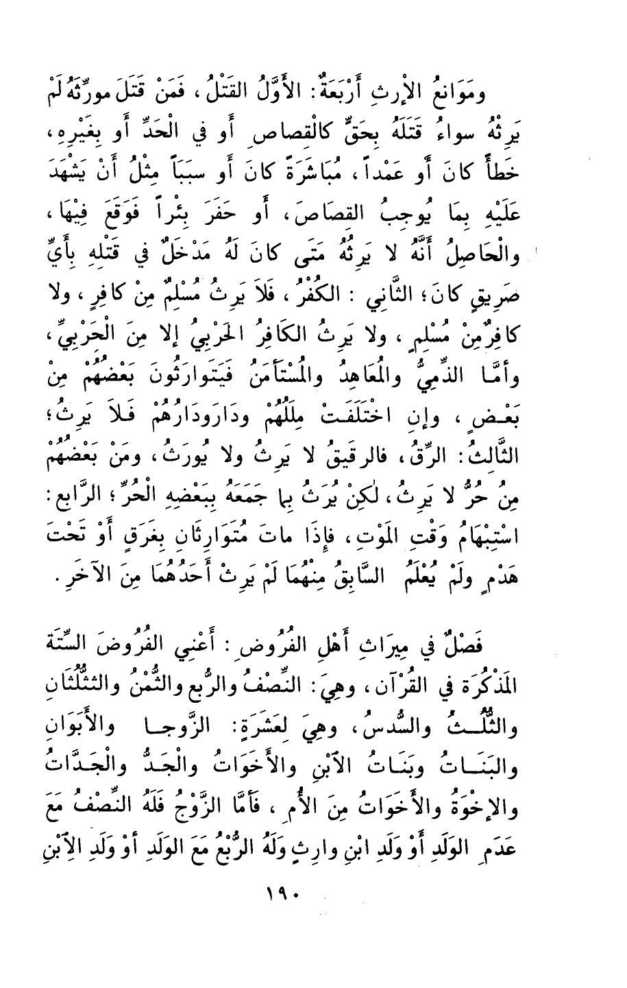 فصْلٌ في ميراثِ أهلِ الفُرُوضِ، أعني الفروض السِّتَّةَ المذكورةَ في القرآنِ، وهي: النصفُ والرُّبُعُ والثُّمُنُ والثُّلُثانِ والثُّلُثُ والسُّدُسُ.
