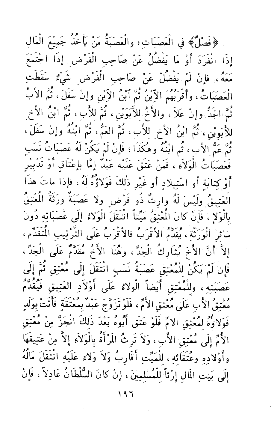 والعصبةُ منْ يأخذُ جميعَ المالِ إذا انفردَ، أو ما يفضُلُ عنْ صاحبِ الفرْضِ إذا اجتمعَ معهُ، فإنْ لمْ يفضُلْ عنْ صاحبِ الفَرْضِ شيءٌ سقطتِ العَصَباتُ. وأقربُ العصباتِ: الابنُ، ثمَّ ابنُ الابنِ وإنْ سفلَ، ثمَّ الأبُ، ثمَّ الجدُّ وإن علا. والأخُ للأبوينِ، ثمَّ للأبِ، ثمَّ ابنُ الأخِ للأبوينِ، ثمَّ ابنُ الأخِ للأبِ، ثمَّ العمُّ، ثمَّ ابنهُ وإنْ سفلَ، ثمَّ عمُّ الأبِ، ثمَّ ابنُهُ، وهكذا.