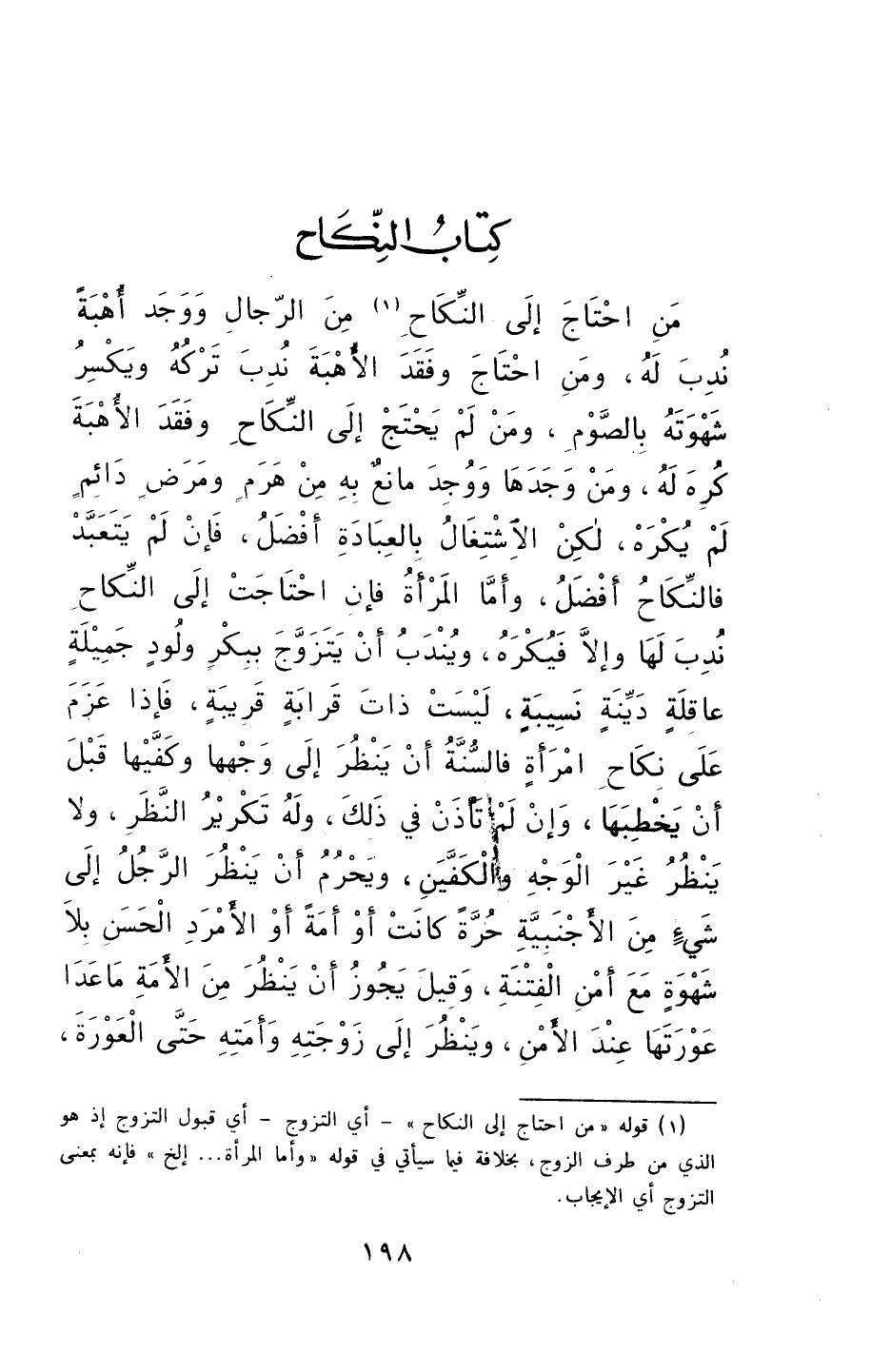 من احتاجَ إلى النكاحِ منَ الرجالِ ووجدَ أُهبةً نُدبَ لهُ، ومن احتاجَ وفقدَ الأُهبةَ نُدبَ تركهُ، ويَكسرُ شهوتَهُ بالصومِ، ومنْ لمْ يحتجْ إلى النكاحِ وفقدَ الأهبةَ كُرهَ لهُ، ومنْ وجدَها ووُجدَ مانعٌ بهِ منْ هَرَمٍ ومرضٍ دائمٍ لمْ يُكرهْ، لكن الاشتغالُ بالعبادةِ أفضلُ، فإنْ لمْ يتعبدْ فالنكاحُ أفضلُ.