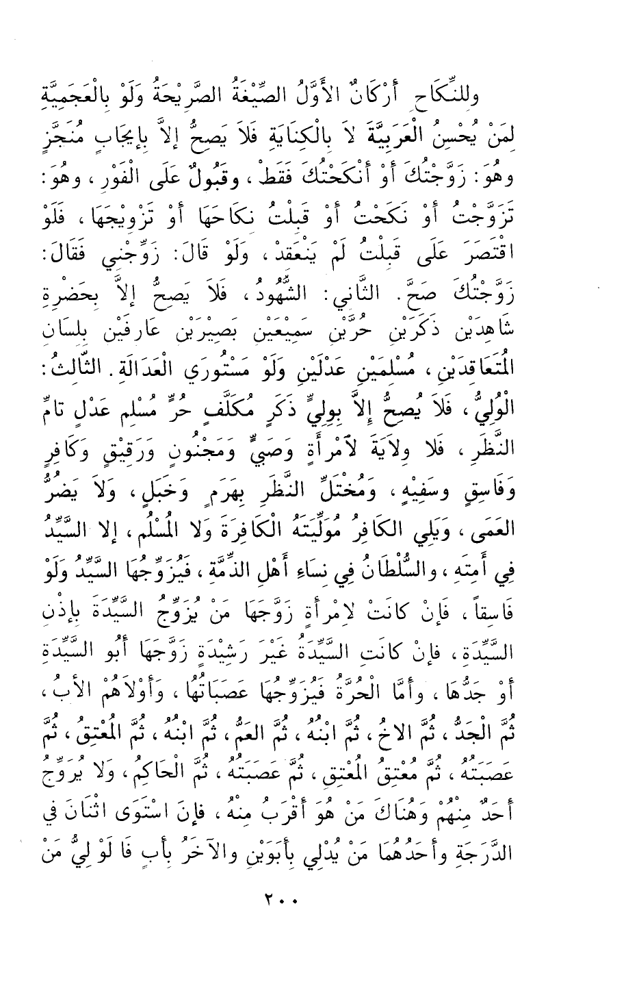 2 - الشهودُ: فلا يصحُّ إلا بحضرةِ شاهدينِ، ذكرينِ، حُرَّيْن، سميعَين، بصيرَيْن، عارفيْنِ بلسانِ المُتعاقدَيْن، مسلمَيْن، عدْلَيْن، ولو مستورَي العدالةِ.
