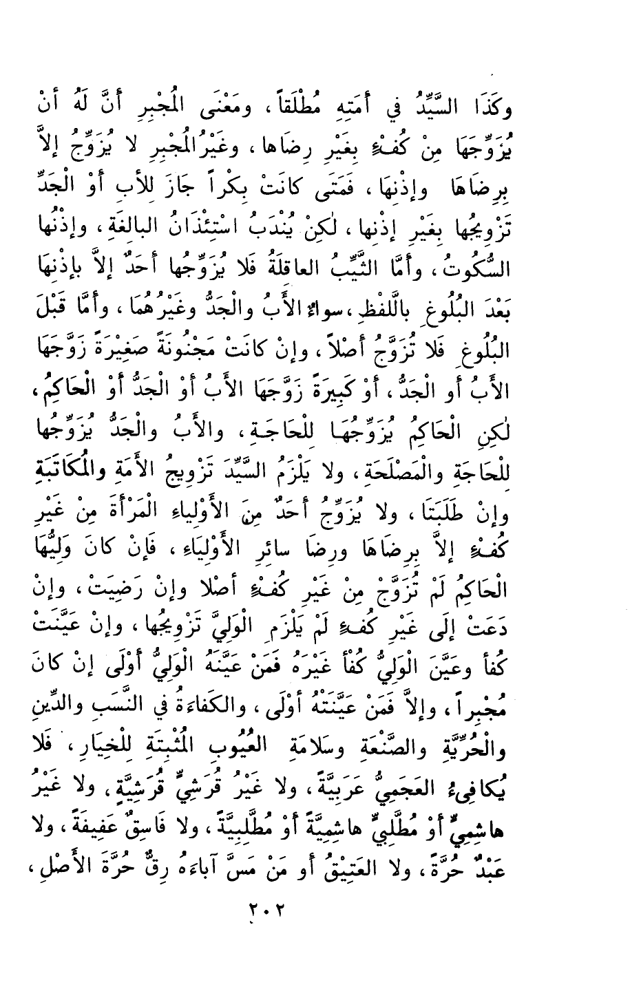 ولا يُزوِّجُ أحدٌ من الأولياءِ المرأةَ من غيرِ كُفءٍ إلا برضاها ورضا سائرِ الأولياءِ، فإن كان وليُّها الحاكمَ لم تُزوَّجْ من غيرِ كُفءٍ أصلاً وإن رضيت، وإن دَعتْ إلى غيرِ كُفءٍ لم يلزم الوليّ تزويجها، وإن عَيَّنتْ كُفْؤاً وعيَّنَ الوليُّ كُفْؤاً غيرهُ فمنْ عيَّنهُ الوليُّ أوْلى إن كانَ مُجبِراً، وإلا فمَنْ عيَّنَتْهُ أوْلى. والكفاءةُ في: النسَبِ والدِّينِ والحريةِ والصَّنعةِ وسلامة العيوبِ المُثْبِتَةِ للخِيار، فلا يُكافئ العجميُّ عربيةً، ولا غيرُ قُرَشيٍّ قُرشيَّةً، ولا غيرُ هاشميٍّ أو مُطَّلبيٍّ هاشميةً أو مطَّلبيةً، ولا فاسقٌ عفيفةً، ولا عبدٌ حرةً، ولا العتيقُ أو من مسَّ آباءَهُ رِقٌّ حرةَ الأصلِ،