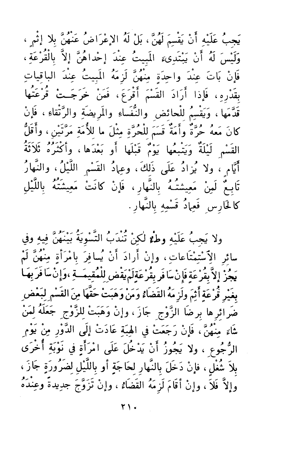 يجبُ أنْ يقسِمَ لهنَّ بلْ لهُ الإعراضُ عنهنَّ بلا إثمٍ، وليسَ لهُ أن يبتدئ المبيتَ عندَ إحداهنَّ إلا بالقُرعةِ، فإنْ باتَ عندَ واحدةٍ منهنَّ لزِمهُ المبيتُ عندَ الباقياتِ بِقَدرِهِ، فإذا أرادَ القسْمَ أقرعَ، فمنْ خرجت قُرعتُها قدَّمها، ويَقسِمُ للحائضِ والنفسَاءِ والمريضةِ والرَّتْقاءَ، فإنْ كانَ معهُ حُرةٌ وأمةٌ قسمَ للحرةِ مثلَ ما للأمةِ مرتينِ، وأقلُّ القسْم ليلةٌ، ويتبعها يومٌ قبلها أو بعدها، وأكثرُهُ ثلاثةُ أيامٍ، ولا يُزادُ على ذلكَ، وعِمادُ القسْمِ الليلُ، والنهارُ تابعٌ لمنْ معيشتُهُ بالنهار، فإنْ كانت معيشتُهُ بالليلِ كالحارسِ فعمادُ قسْمهِ بالنهارِ.