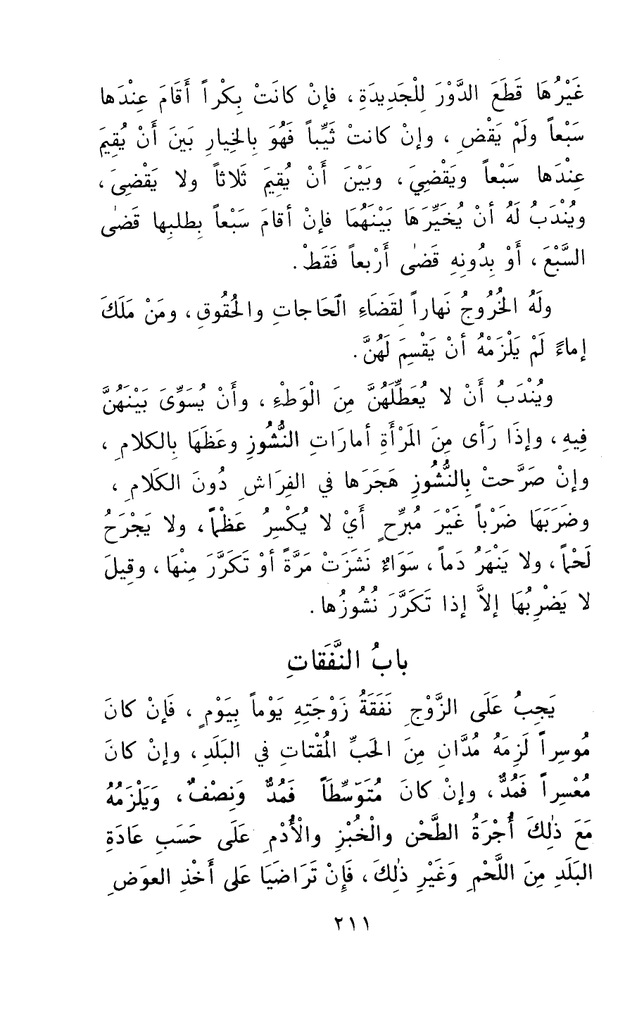يجِبُ على الزَّوْجِ نَفَقَةُ زَوْجتهِ يوْماً بيومٍ، فإنْ كانَ مُوسِراً لَزِمَهُ مُدَّانِ مِنَ الحَبِّ المُقتاتِ في البلدِ، وإنْ كانَ مُعْسِراً فَمُدٌّ، وإنْ كانَ مُتَوَسِّطاً فمُدٌّ ونصفٌ، ويَلْزَمُهُ معَ ذلكَ أُجْرةُ الطَّحْنِ والخَبْزِ والأُدمِ على حسبِ عادةِ البلدِ منَ اللَّحْمِ والدُّهْنِ وغيرِ ذلكَ، فإنْ تراضَيا على أخْذِ العِوضِ