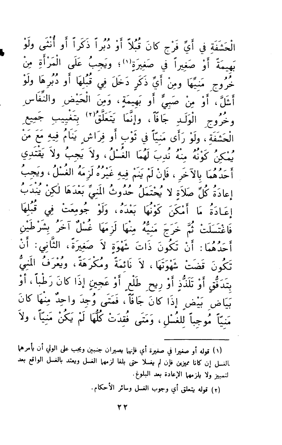 الحشفة في أي فرج كان، قبلاً أو دبراً، ذكراً كان أو أنثى، ولو بهيمة، أو صغيراً في صغيرة. ويجب على المرأة من خروج منيها، ومن أي ذكر دخل في قبلها أو دبرها، ولو أشل، أو من صبي، أو بهيمة.