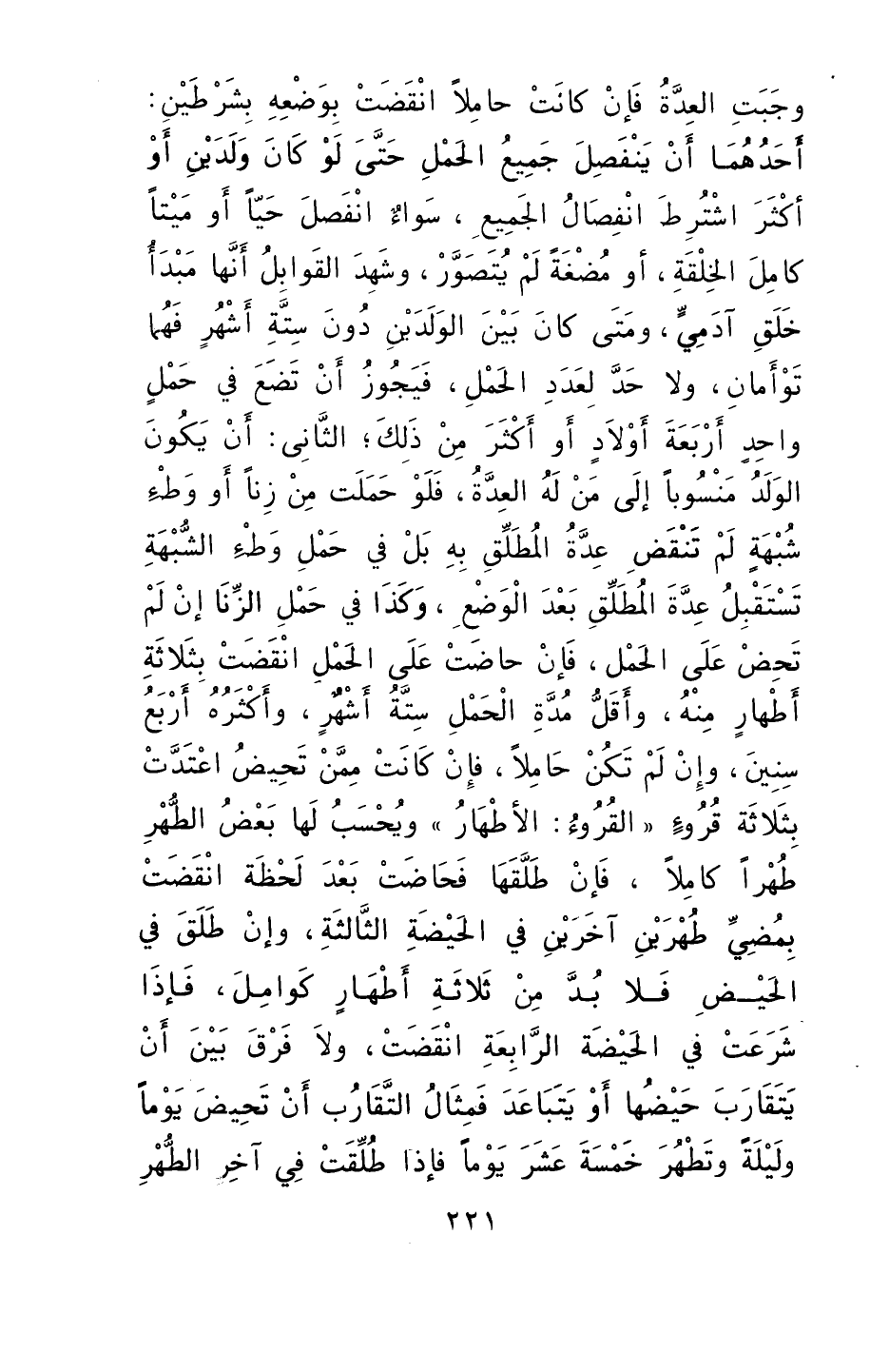 وإنْ لمْ تكَنْ حاملاً: فإنْ كانتْ ممَّنْ تحيضُ اعتدَّتْ بثلاثةِ قُروءٍ "القروءُ: الأطهارُ"، ويُحْسبُ لها بعْضُ الطُّهرِ طُهْراً كاملاً، فإنْ طلَّقها فحاضتْ بعدَ لحظةٍ انْقضتْ بمُضيِّ طُهرينِ آخرينِ والشُّروعُ في الحَيْضةِ الثالثةِ، وإن طلَّقَ في الحيضِ فلا بُدَّ منْ ثلاثةِ أطْهارٍ كواملَ فإذا شَرَعَتْ في الحيْضةِ الرَّابعةِ انْقضتْ، ولا فرقَ بينَ أنْ يتقاربَ حيْضُها أو يتباعدَ. فمثالُ التَّقاربِ: أنْ تحيضَ يوْماً وليْلةً وتَطْهُر خمسةَ عشَرَ يوْماً، فإذا طُلِّقَتْ في آخرِ الطُّهرِ